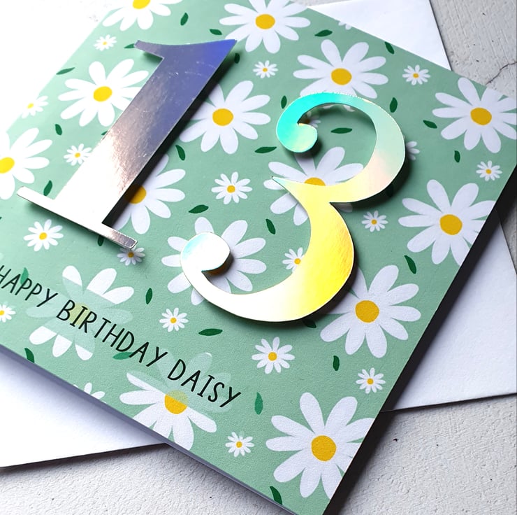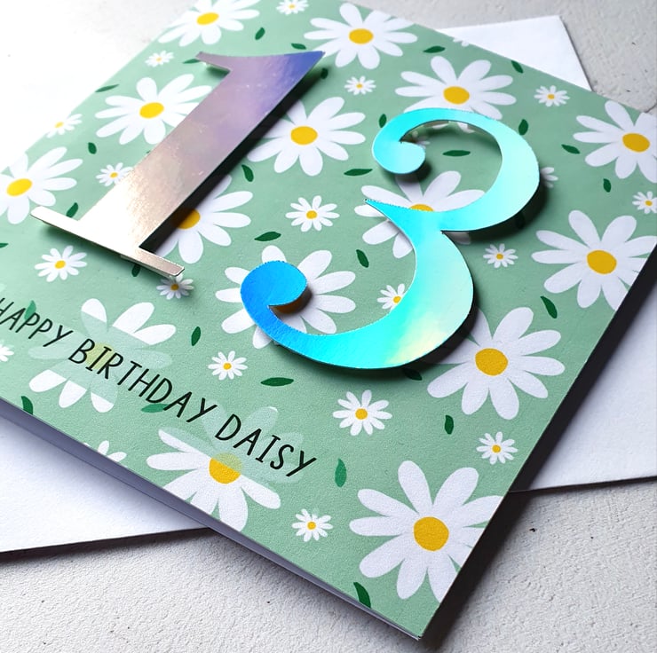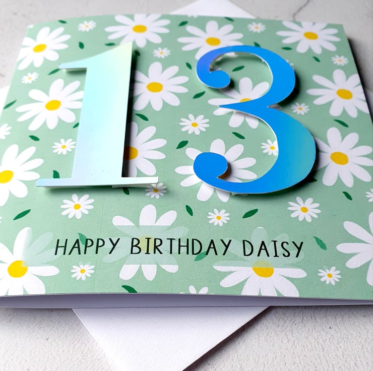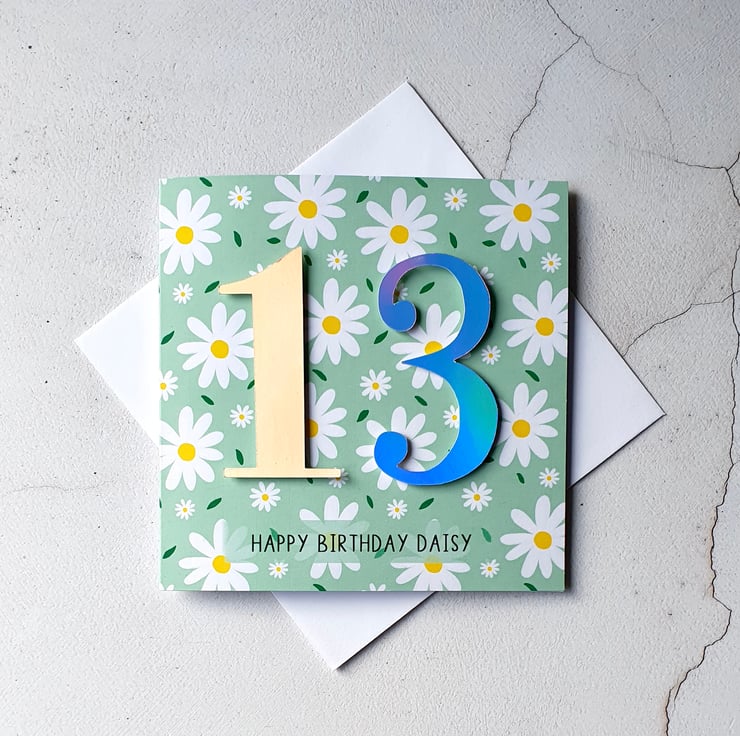 A beautiful 13th birthday card with a daisy print background. This card is personalised with a name to make it extra special and a guaranteed keepsake for a milestone birthday! Perfect for those that love anything floral!