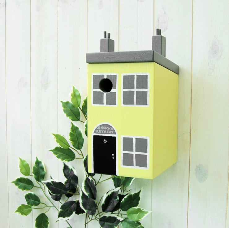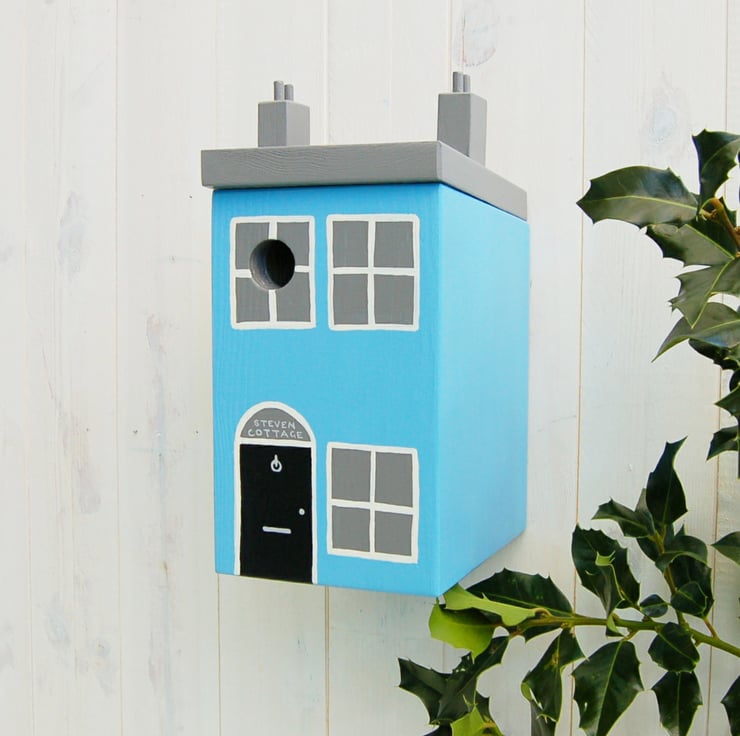 The seaside cottage bird box is painted in either blue, lemon or pink with a grey roof. It's perfect for the aspiring seaside cottage owner! The box has the option of personalisation above the door with up to 2 lines of up to 8 characters each, making it even more special.