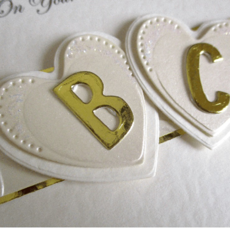 Embellished with a pair of sparkly ivory hearts along with the initial of each recipient, die cut from metallic gold card, plus two small pearlescent ivory daisy flowers with gold glitter centres
