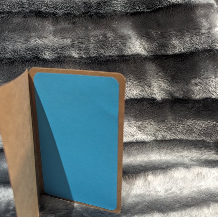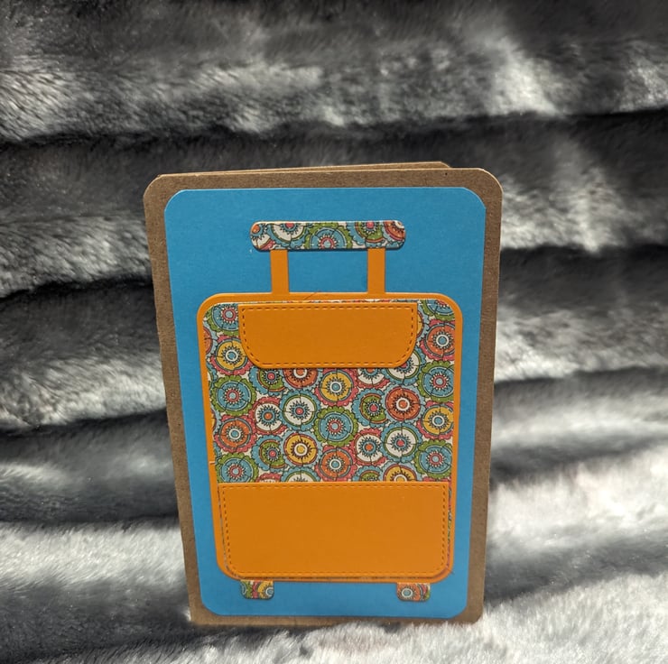 A6 portrait kraft card stock overlaid with a bright blue card stock, overlaid with a suitcase die cut in bright orange and retro patterned paper/card