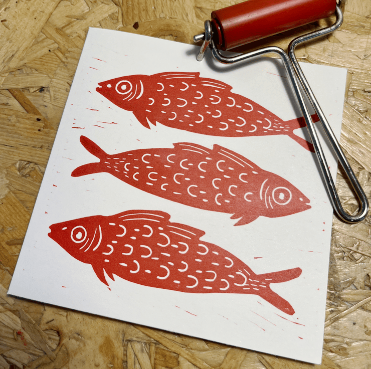 Three fun Fishes make up this cute, handprinted, lino print greetings card