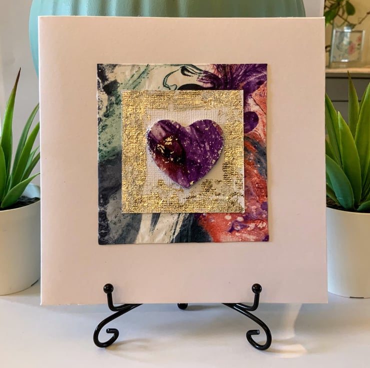 A lovely wood heart has been decoupaged with fine art paper mounted on white embossed card with silver leaf and mounted on the same design art paper in shades of purple, green, blue, reds,grey and white in a marble effect design.