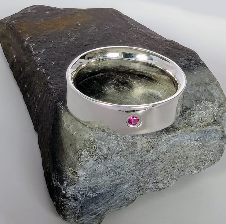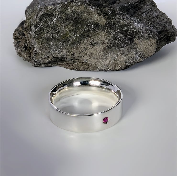 Minimalistic design, polished silver ring set with a little ruby.