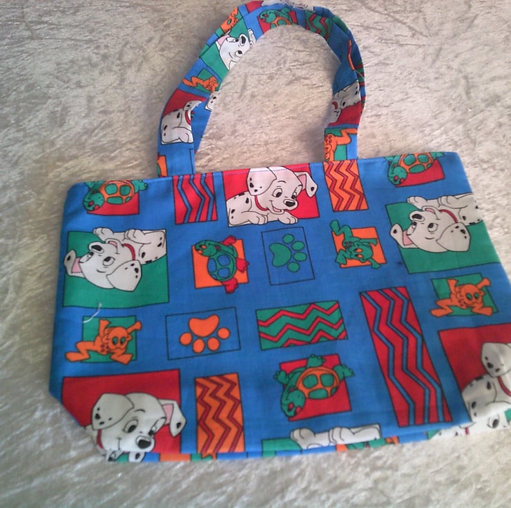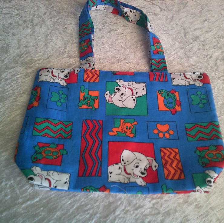 This Eco Friendly, fabric bag is made using 100% Cotton and has Dalmatians, tortoises, frogs and paw prints in red and blue squares. It is fully lined and is machine washable.