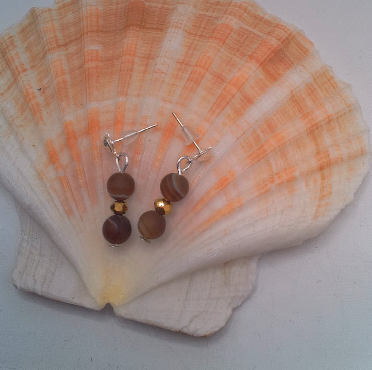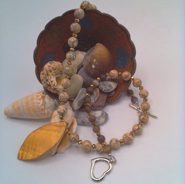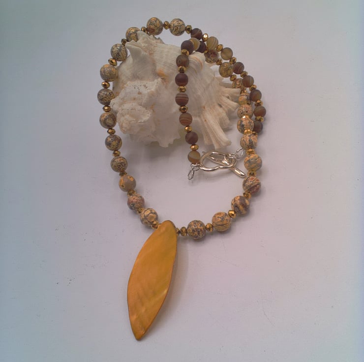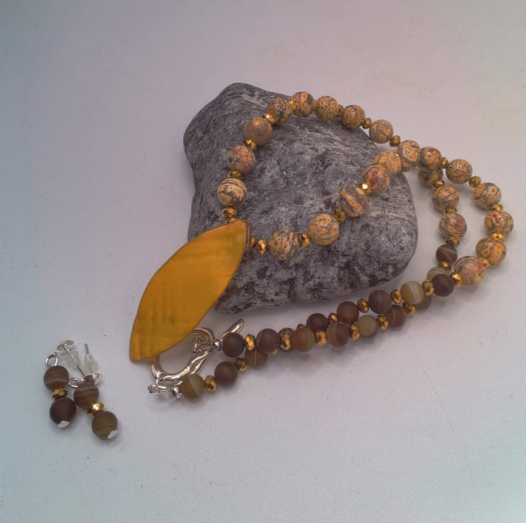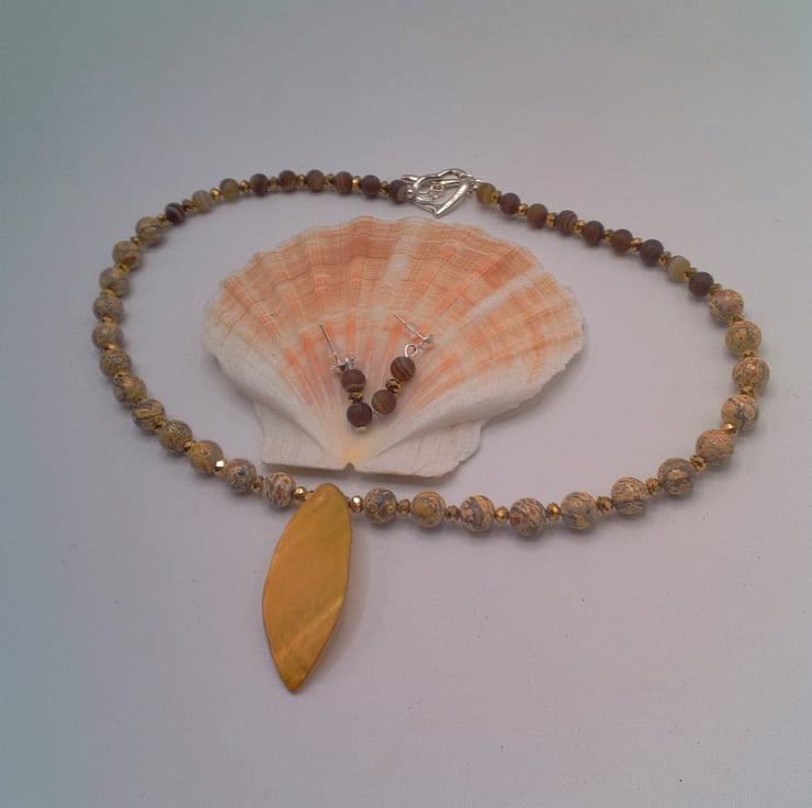 This gorgeous 2 piece set comprises a necklace with a shell leaf pendant and a pair of earrings. The necklace is made using 8 mm mottled earthy toned jasper beads, 6 mm variegated brown agate beads and 3 mm gold plated faceted beads with a 45 mm x 20 mm lustered shell leaf pendant at the centre. It is fastened with a pretty silver plated heart toggle clasp. The earrings are made with the agate bead and the gold faceted bead suspended on silver plated studs. The necklace is 19 inches ( 48.5 cm) in length, with a drop of 1.75 inches (4.5 cm) for the leaf pendant and the earrings have a drop of 0.75 inch (2 cm) from the base of the lever back. The set will be dispatched wrapped in tissue paper in an organza bag and delivered via Royal Mail first class post. This set would be perfect to wear for a casual day or evening out or it would make an ideal gift for any lady.