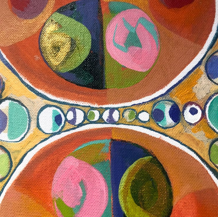 Colourful Acrylic painting on canvas, size 40.5x30.5cm Abstract study of circles meeting circles within and beside circles, interacting colours bring movement to this painting. Ready to hang as it is, make a perfect gift to brighten your friends home. An original artwork from the artist’s studio.