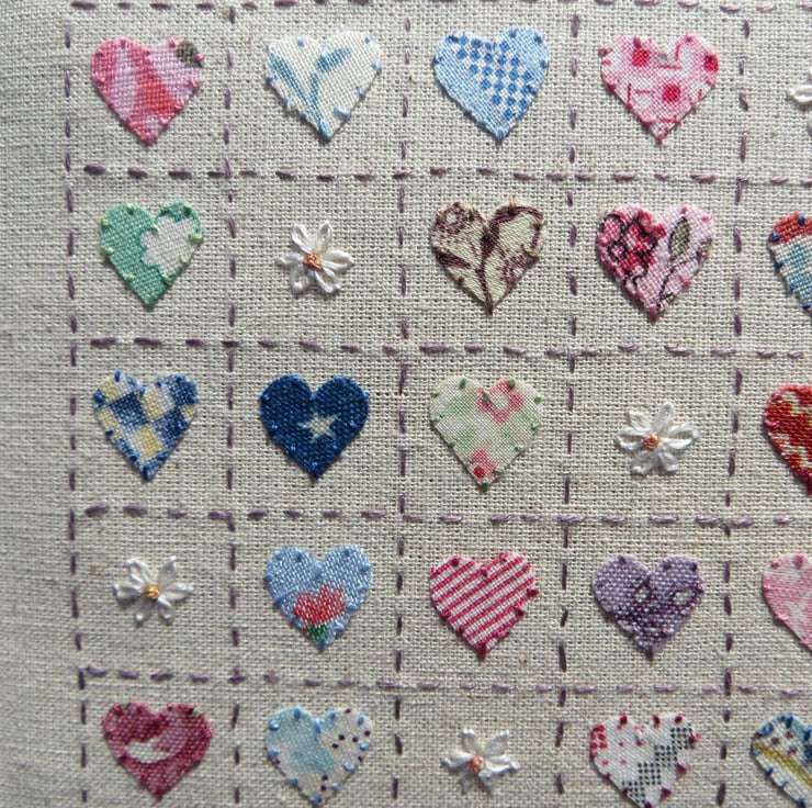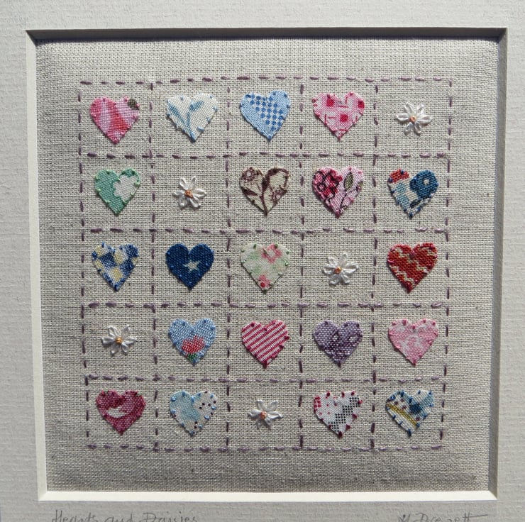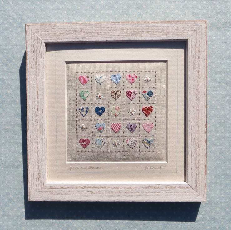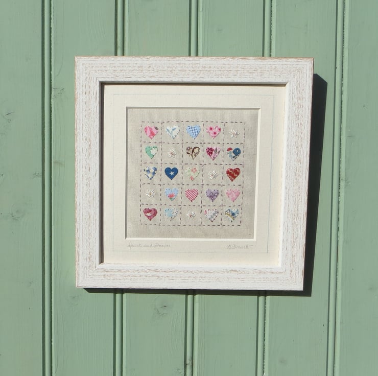 Perfect gift when you want to send lots of love! A small hand-stitched framed textile featuring little applique hearts cut from a variety of pretty vintage cottons with embroidered daisies here and there. The design is worked within a running stitch grid. Heartwarming addition to a corner of your home, and a lovely gift idea too. Lots of other designs in my shop.