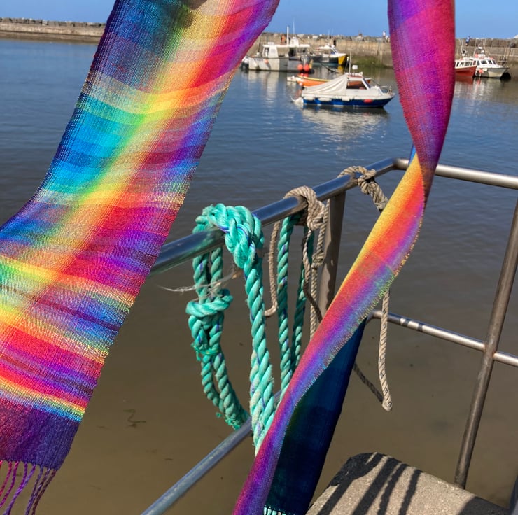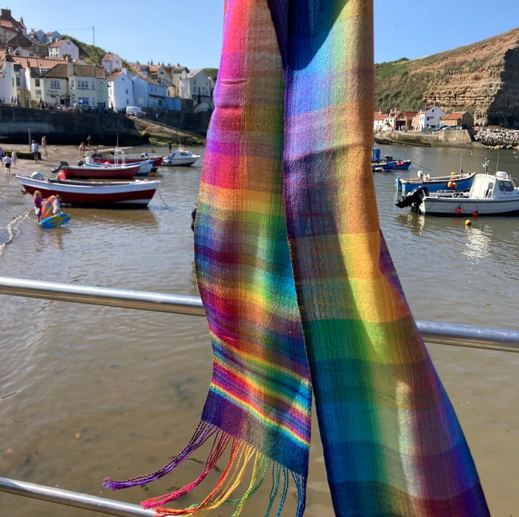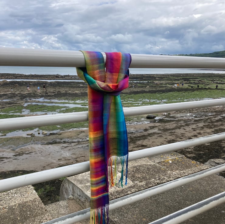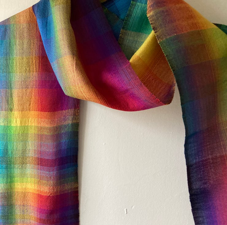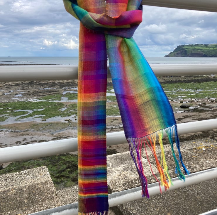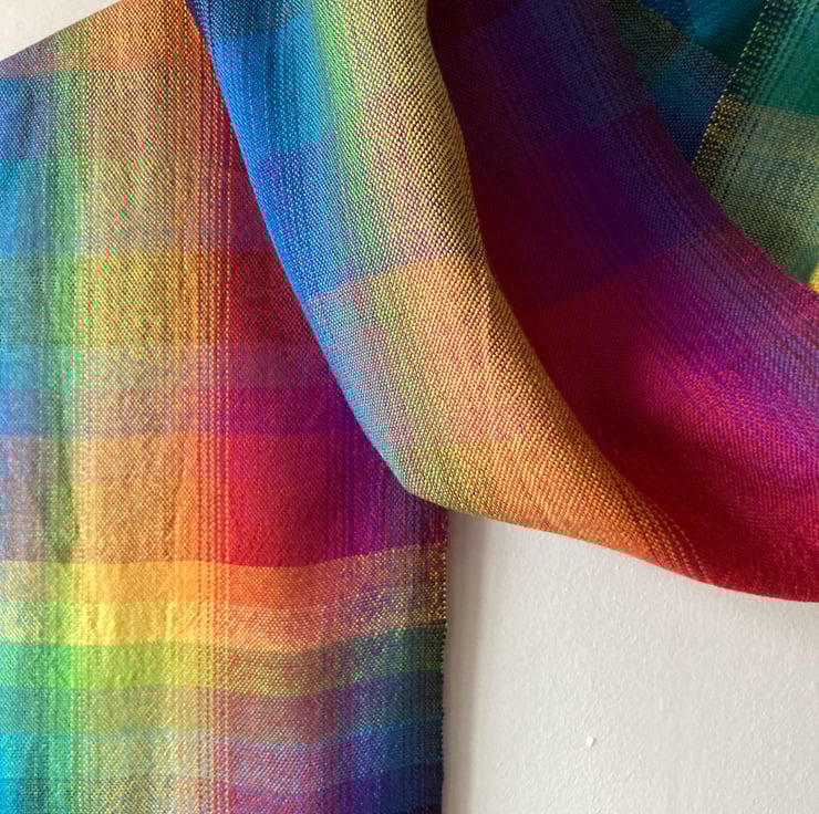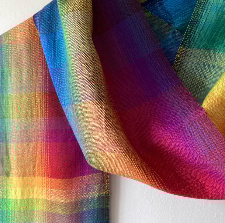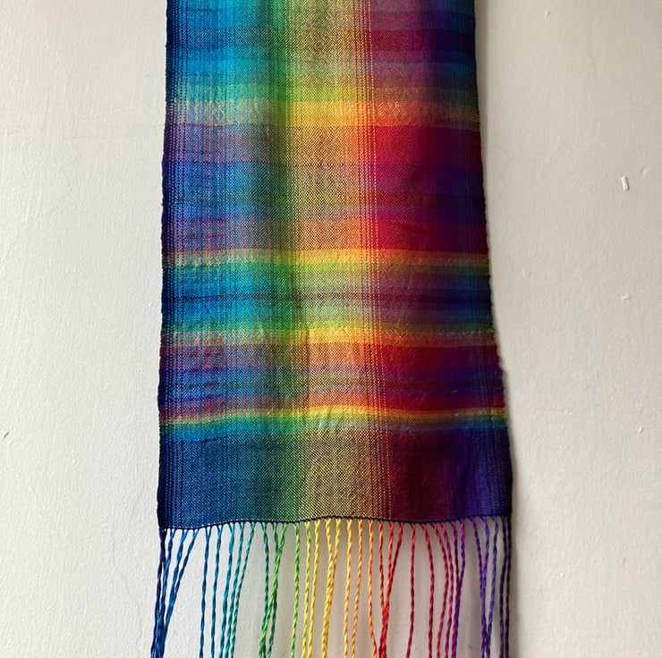 A real labour of love. Handwoven in very fine spun silk in a full spectrum Fibonacci gradient and a gradient in weft. Finished with a fringe, this scarf can equally be displayed as a wall hanging. The colour blending produces true iridescence due to the shades selected, the sheen, the fineness of the silk and the weave structure. This piece is a real showstopper- very soft, with superb drape and shine. This unique piece took 3 weeks to create.