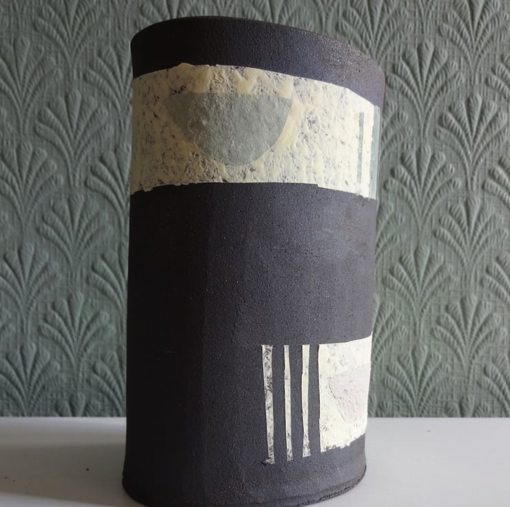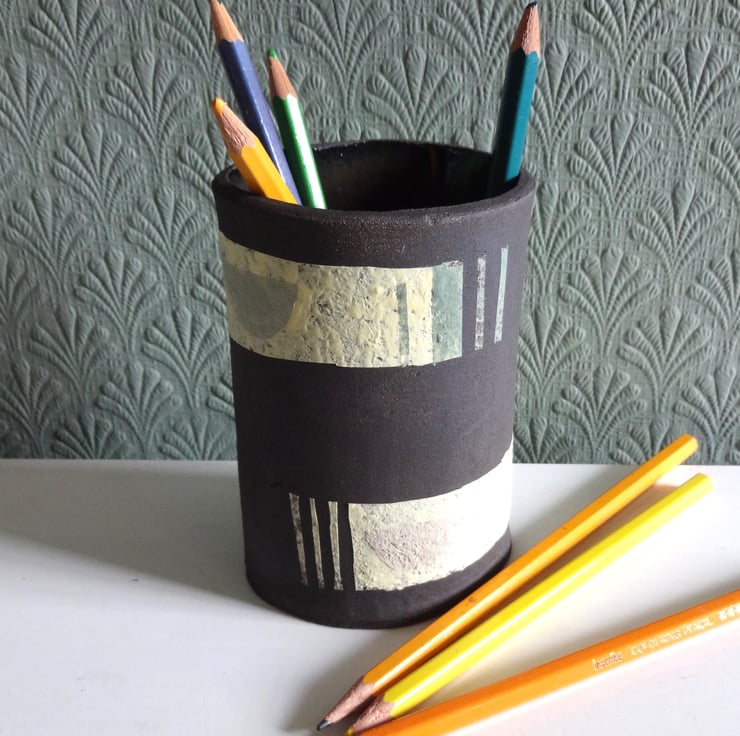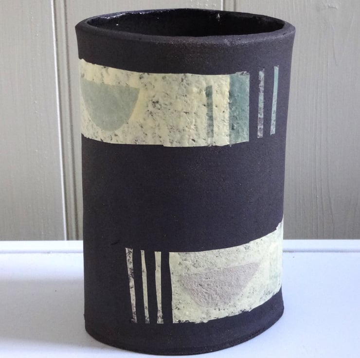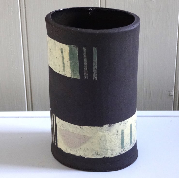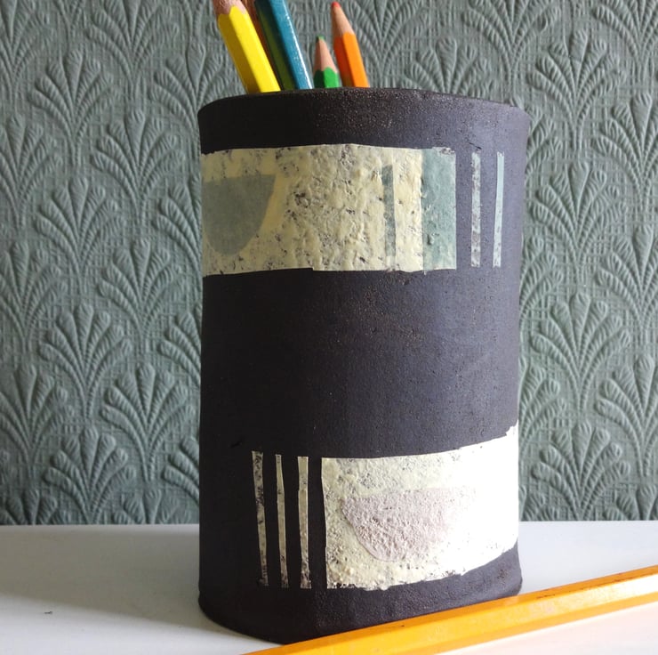 This stylish handmade individual ceramic vessel can be used as a vase, pencil pot, bathroom accessory, houseplant holder or simply a piece of modern art in your home. I made this one-off piece in black stoneware clay and decorated the surface with abstract bands and motifs in pastel shades which are fired into the clay – it’s not just paint! The inside is glazed with an iron lustre finish giving shades of russet, very dark blue and brown. The outside is the matt finish of the black clay and coloured slip of my original design. The vibe is mid-century modern and it will look striking in almost any room in your home. 12cm high x 8cm at the widest part of the oval base.