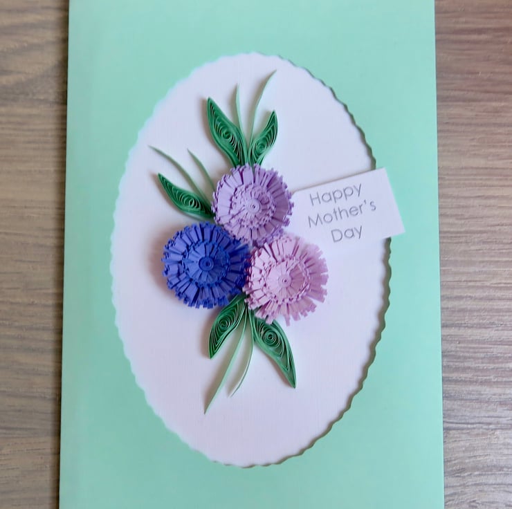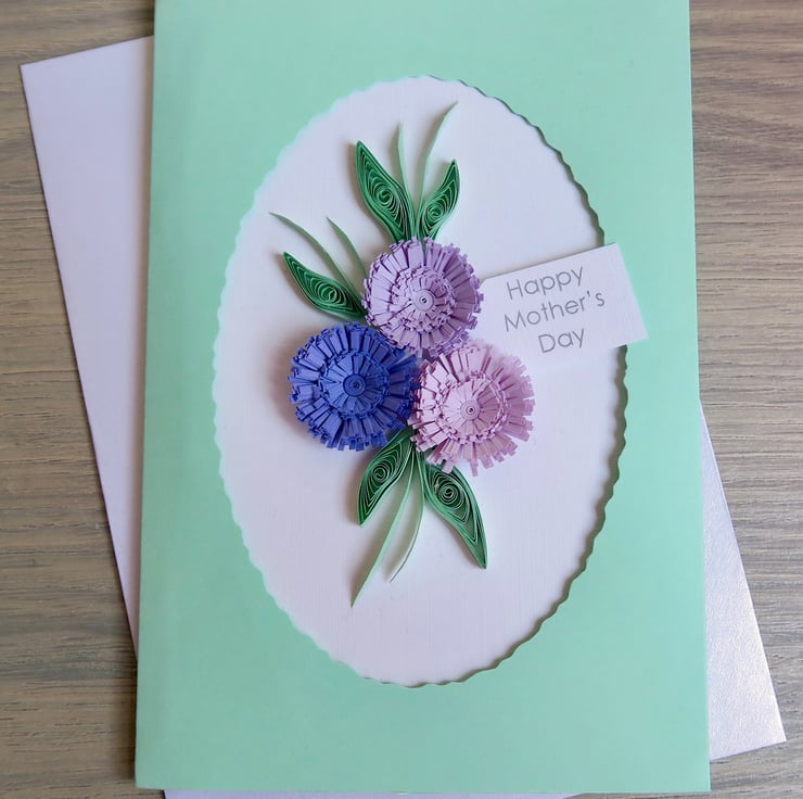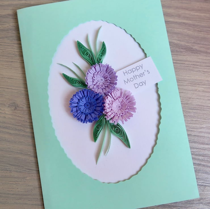 A very pretty and unusual quilled card to send your love to your mum on Mother's Day – you will not find anything like this in the shops.