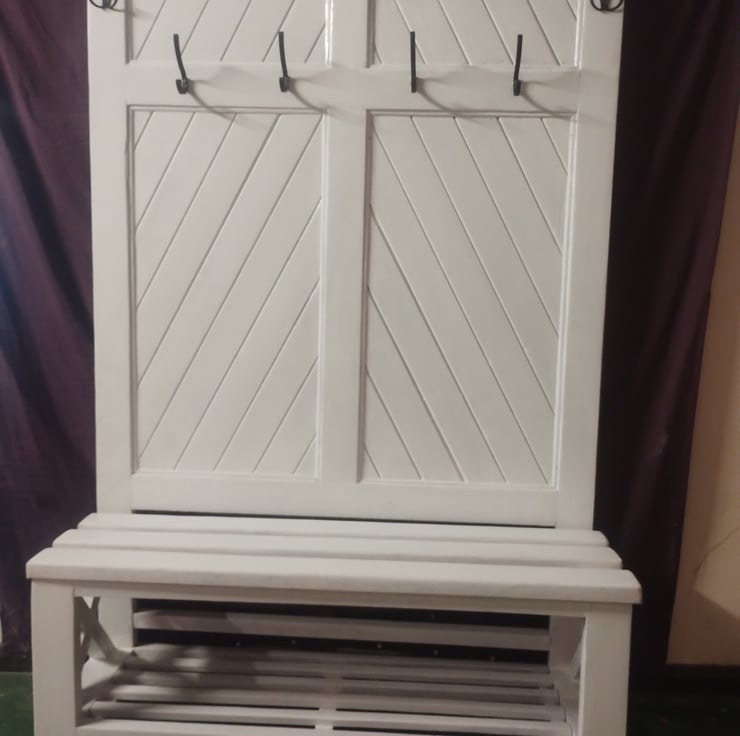 Standing at a little under six feet, here is our coat haven, sit on the sturdy bench while you don your footwear, stored beneath in aerated ample space.