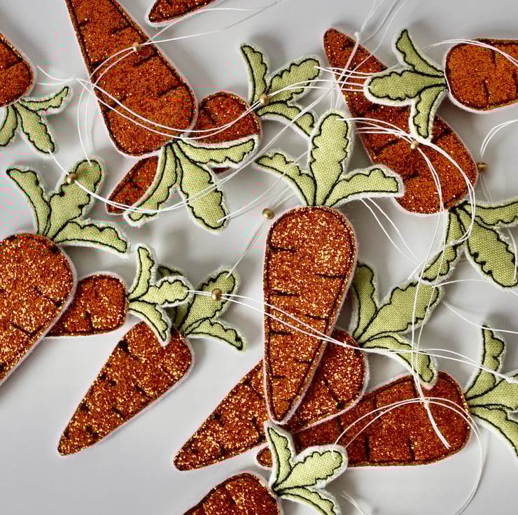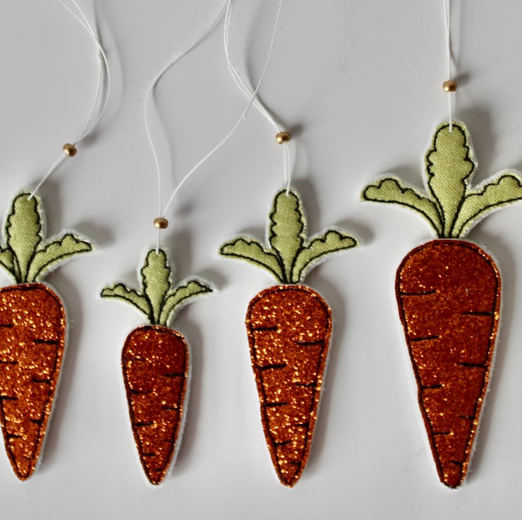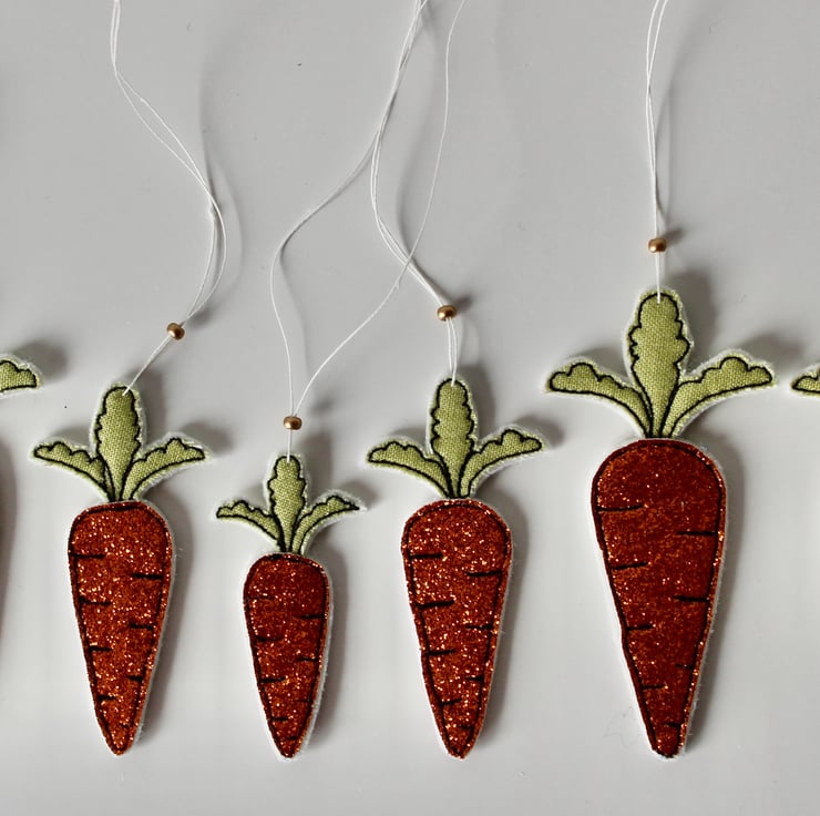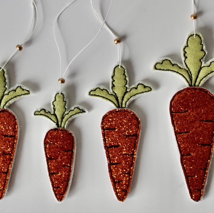 Each carrot is created using multiple layers of cloth, sewn using freehand machine embroidery and then cut out by hand. There is a linen thread to hang and a metallic glass bead to finish.