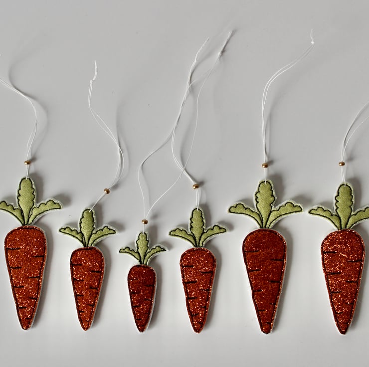 Each pack of 'Carrot Hanging Decorations' contains six carrots, with the larger measuring approximately 7cm by 4cm and the smaller 5cm by 2.5cm.