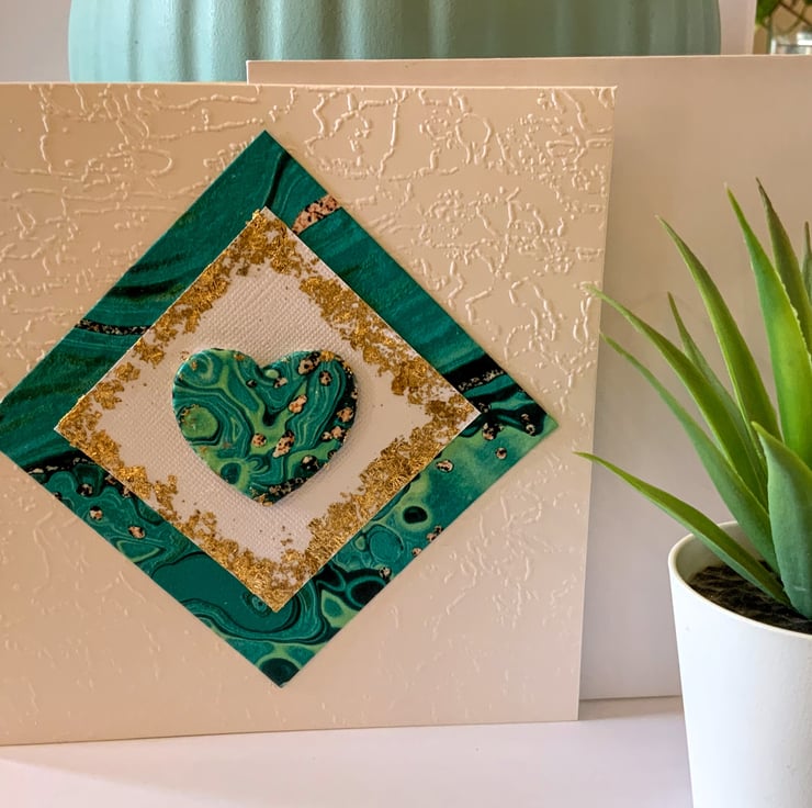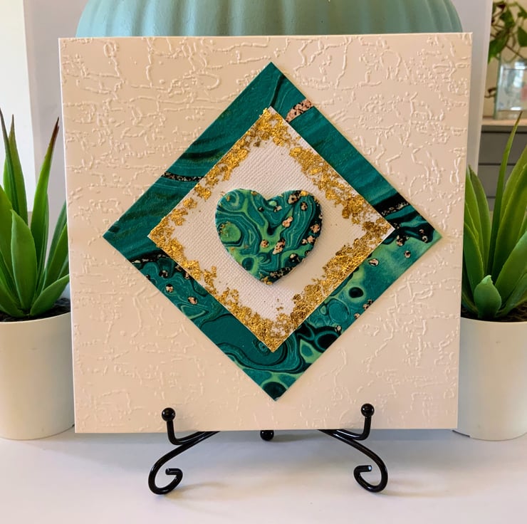 A lovely wood heart has been decoupaged with fine art paper mounted on white embossed card with gold leaf and mounted on the same design art paper in shades of greens and gold in a marble effect design.