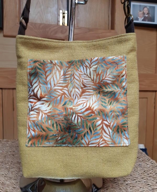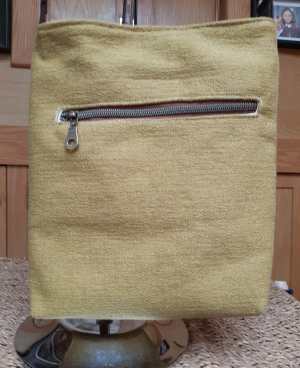 Neat crossbody bag in gold canvas, with zipped pocket on the back and coordinating batik cotton print patch pocket on the front. Lined in soft yellow cotton, with inner pockets, adjustable cotton webbing strap and magnetic fastener.
