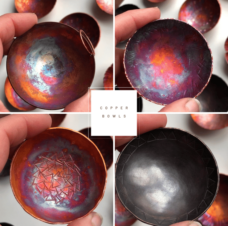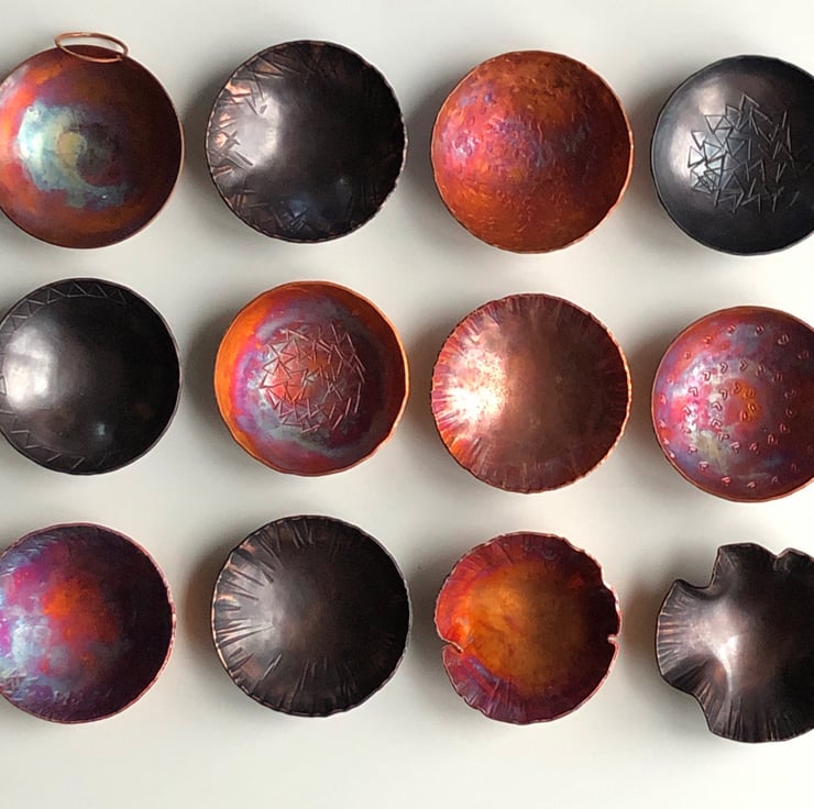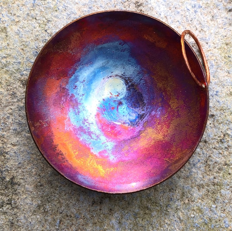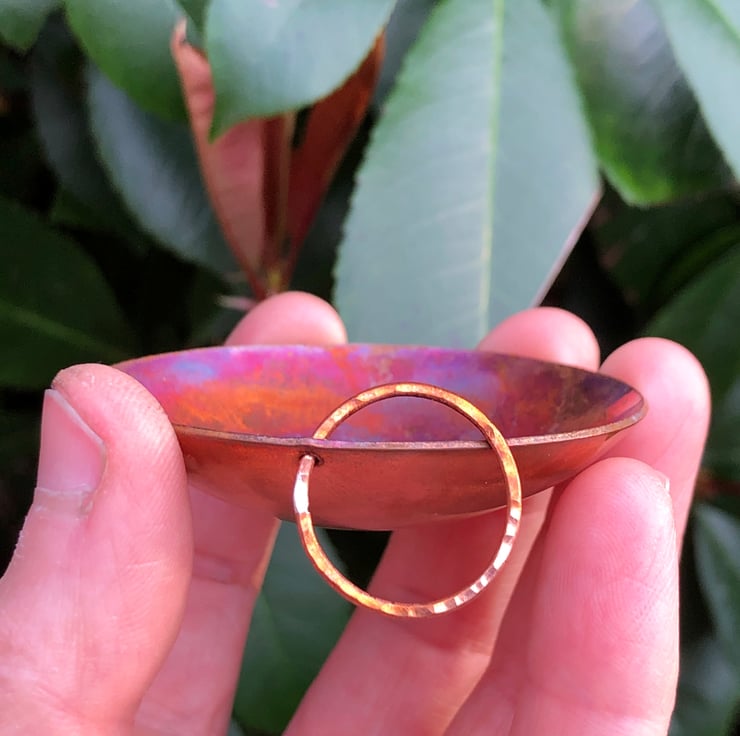 These tiny copper bowls are formed from flat sheet and have a small copper ring attached at one side. The colour is achieved with heat and is completely unique every time.