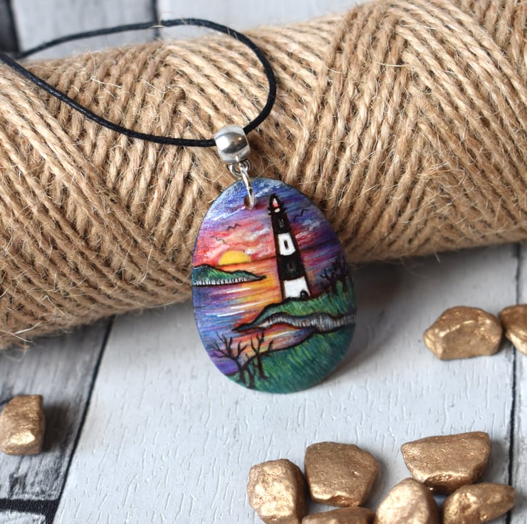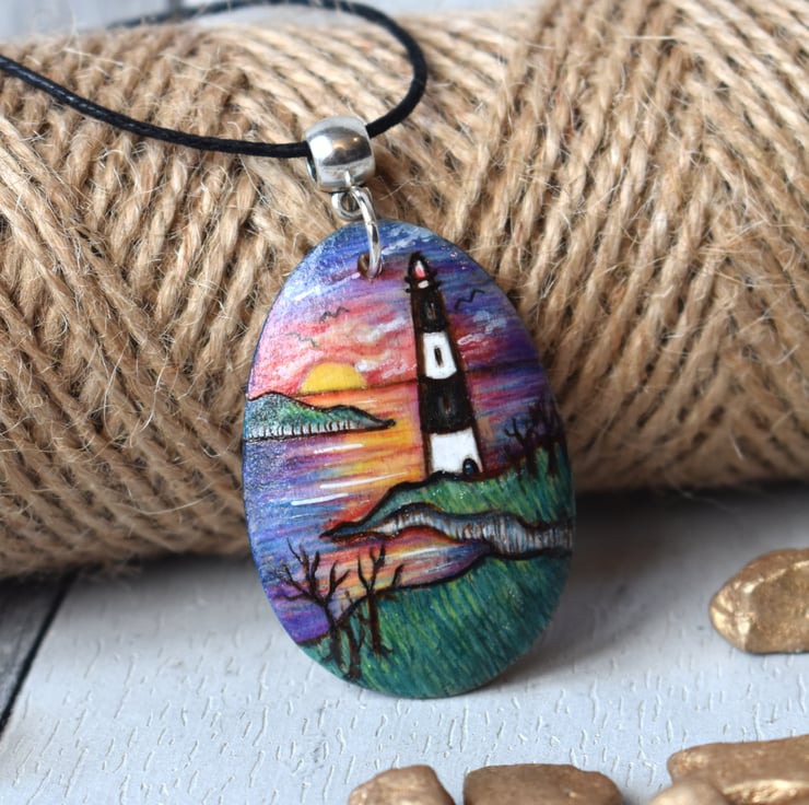A coastal themed pendant, with a lighthouse and sunset. Hand burned using pyrography and coloured with art pencils and inks.