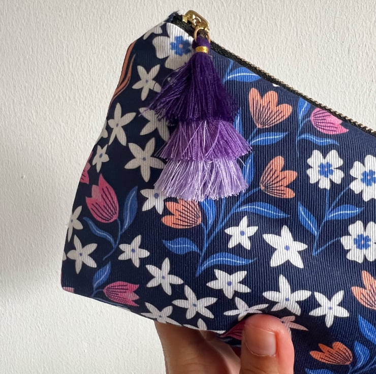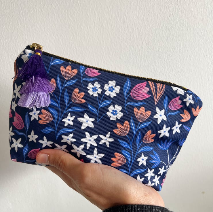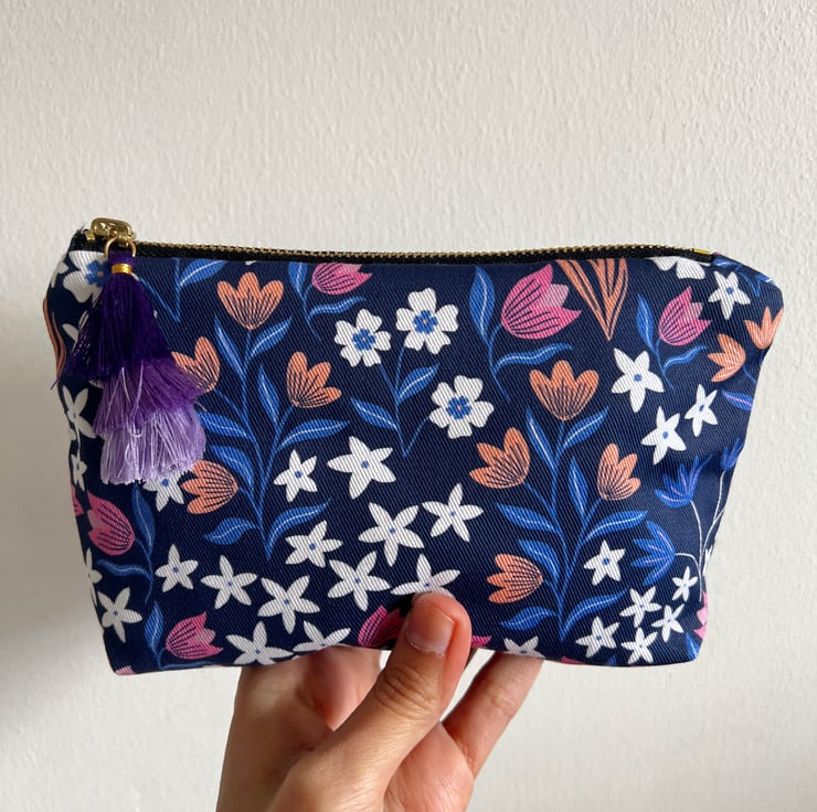 This Navy Blue Florals Makeup Bag features a vibrant Cottagecore style floral botanical pattern, inspired by Blue Bell bushes, daisies and tulips, I see in my local park on my walks and the lovely butterflies that come visit the flower beds. The design is uniquely illustrated and crafted by myself.