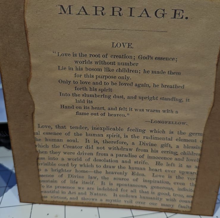 Card overlaid with beige parchment type paper with a religious themed marriage poem