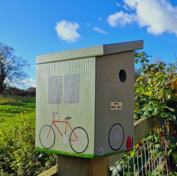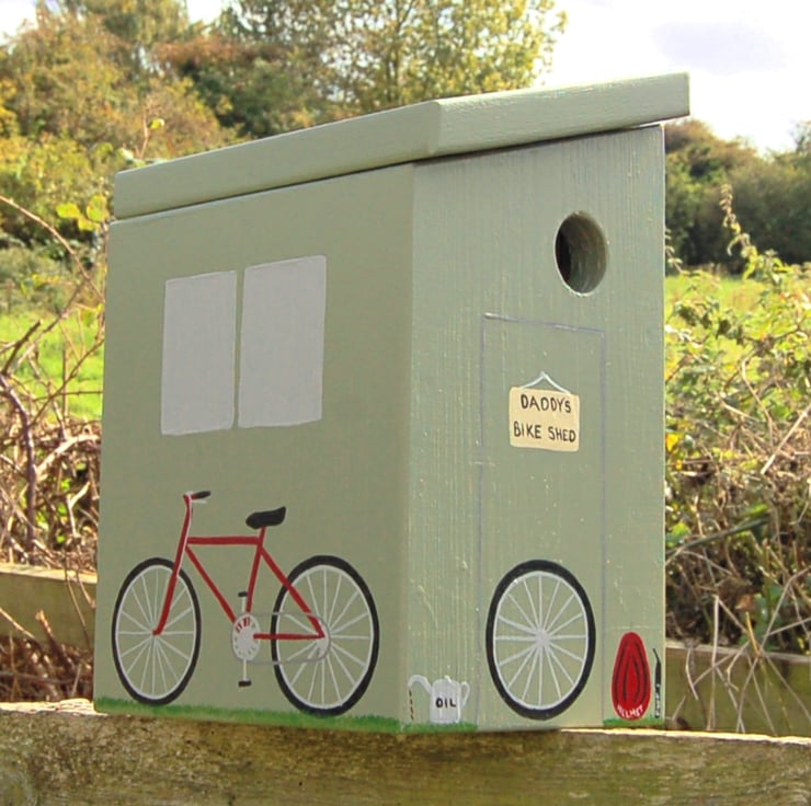 Our Bike Shed Bird Box is perfect for cyclists who love the garden. The bike shed can be personalised making it an ideal gift. It will make a fabulous and unique gift for a birthday,& retirement, house-warming, anniversary, and a variety of other special occasions too. The bike shed bird box is painted Sage Green with a red bike and a few additional bike accessories painted on (an oil can, spare bike wheel, bike helmet, and pump). The cream sign on the door can be personalised with 2 lines of up to 12 characters each, making the bird box even more special.