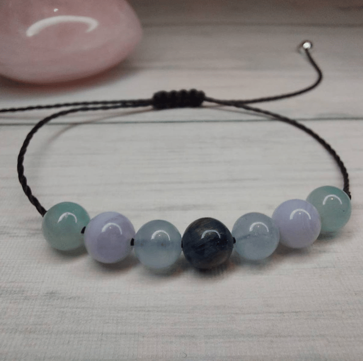 Features Amazonite, Blue Lace Agate, Aquamarine and Kyanite (6mm) round beads