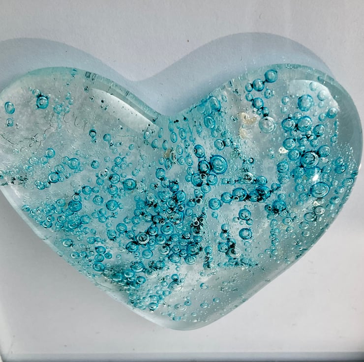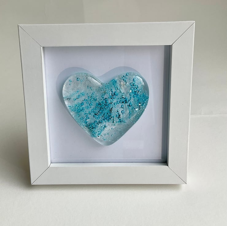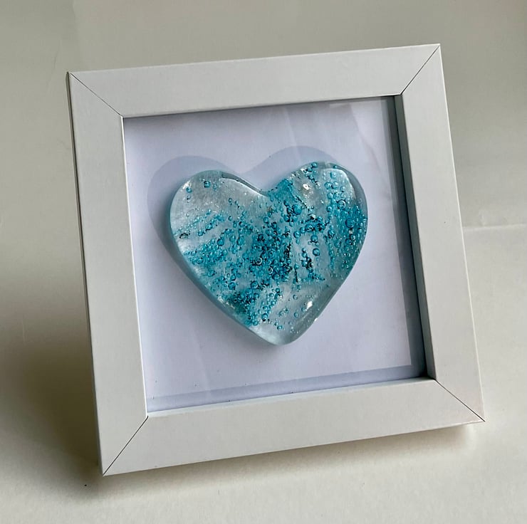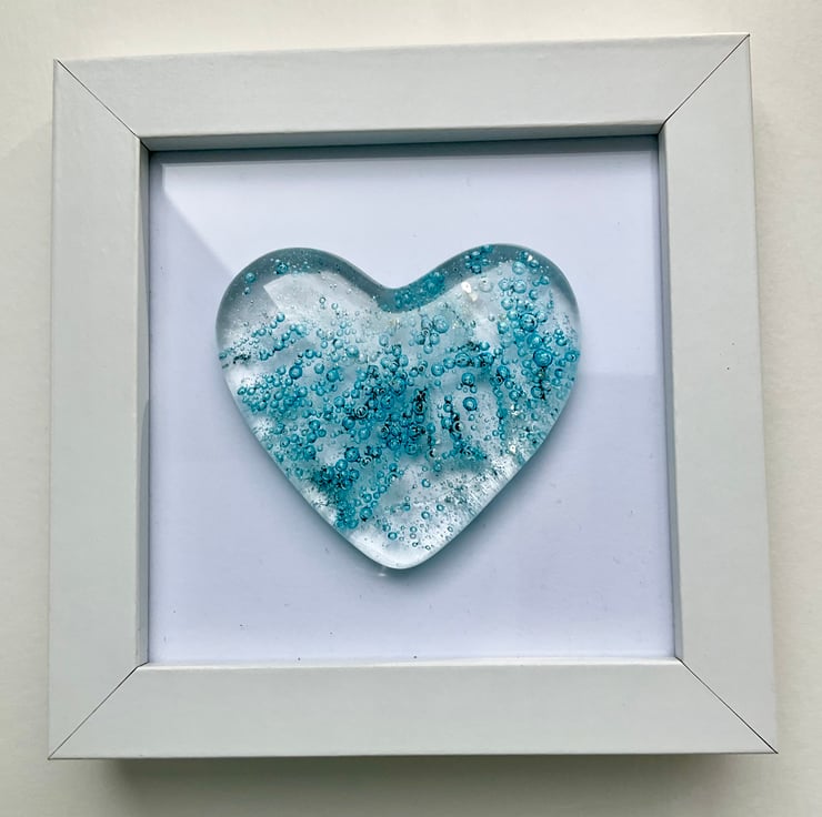 This is a handmade fused glass cast heart in a white frame. All the glass has been cut by hand from bullseye art glass and cast within my kiln. This has a beautiful delicate pale blue bubbly heart design in a simple white frame. Each heart is completely unique and would make an ideal gift for a loved one.