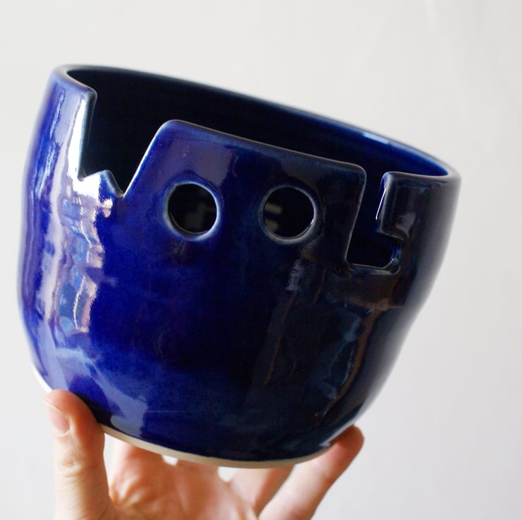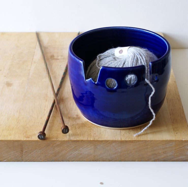 This bowl has been glazed in a rich dark blue hue. Treat yourself or a fellow knitting enthusiast with this hand crafted yarn bowl!