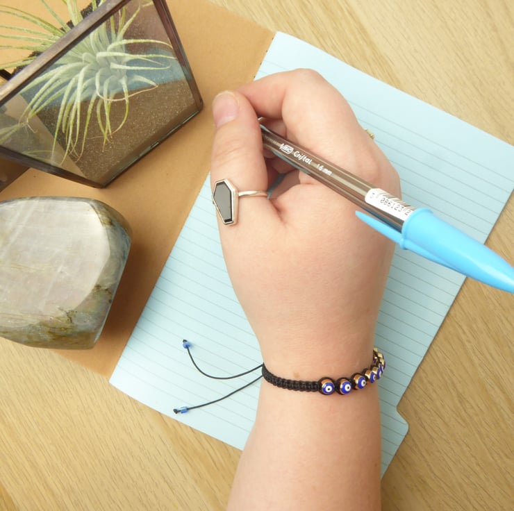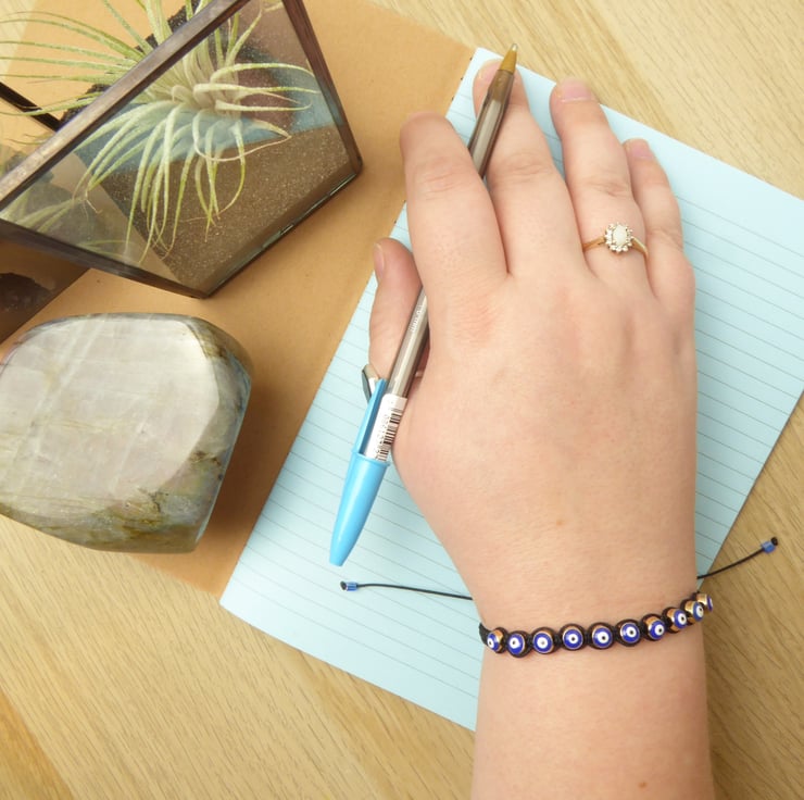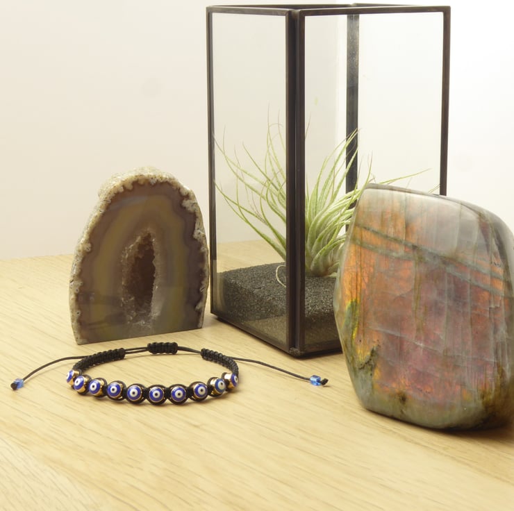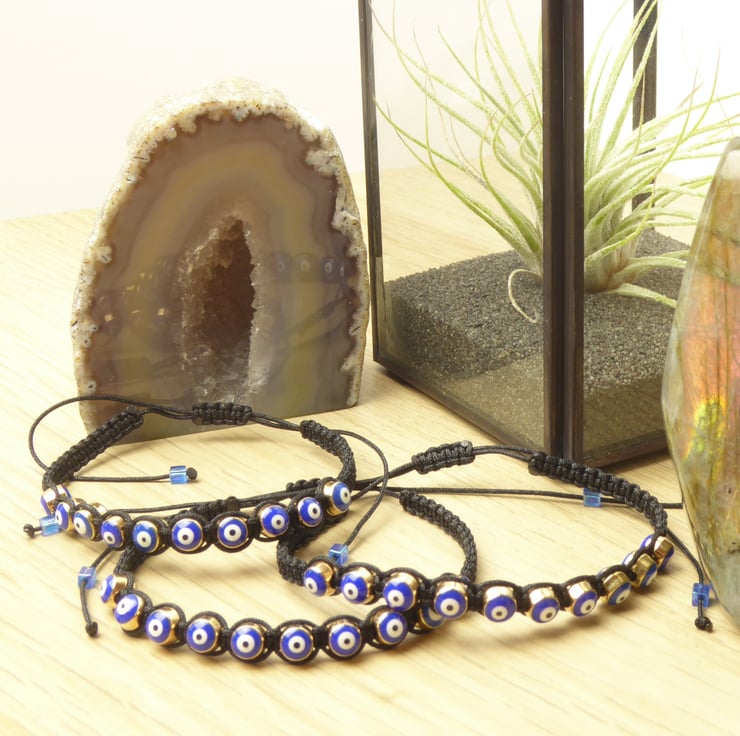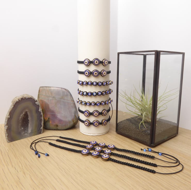 This bracelet is made from fine paracord and enamel evil eye beads. The design features braided macrame and ten enamel, evil eye beads clustered in the centre of the bracelet. The piece is fully adjustable and is finished with a sliding knot so that you can easily put on, adjust and take off the bracelet without help from another person.