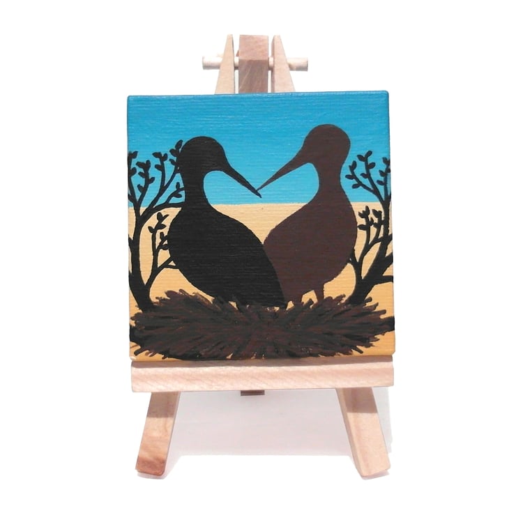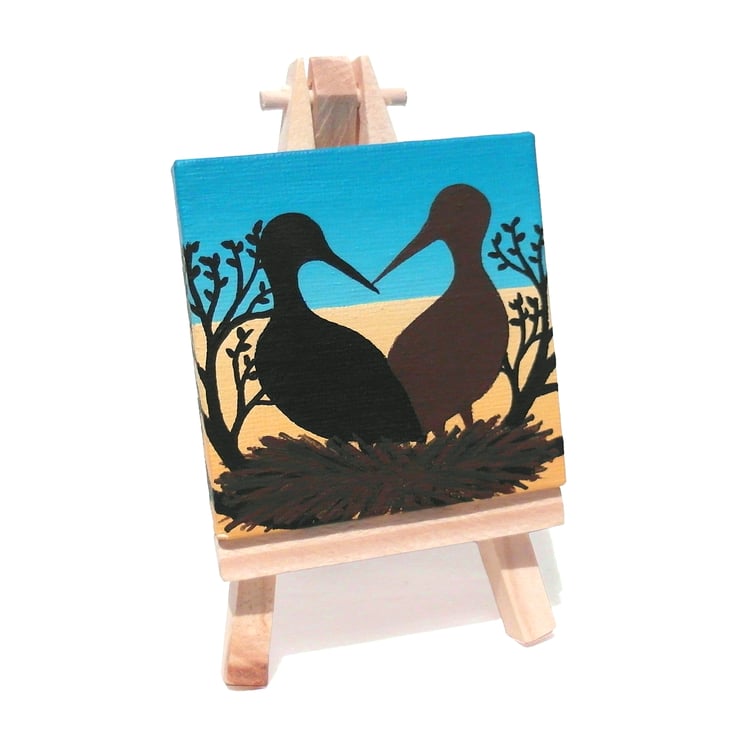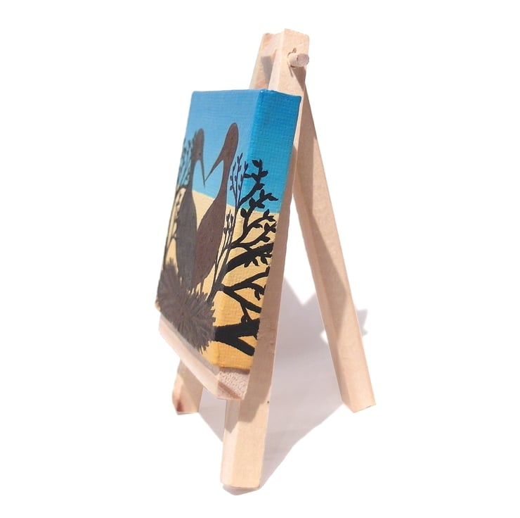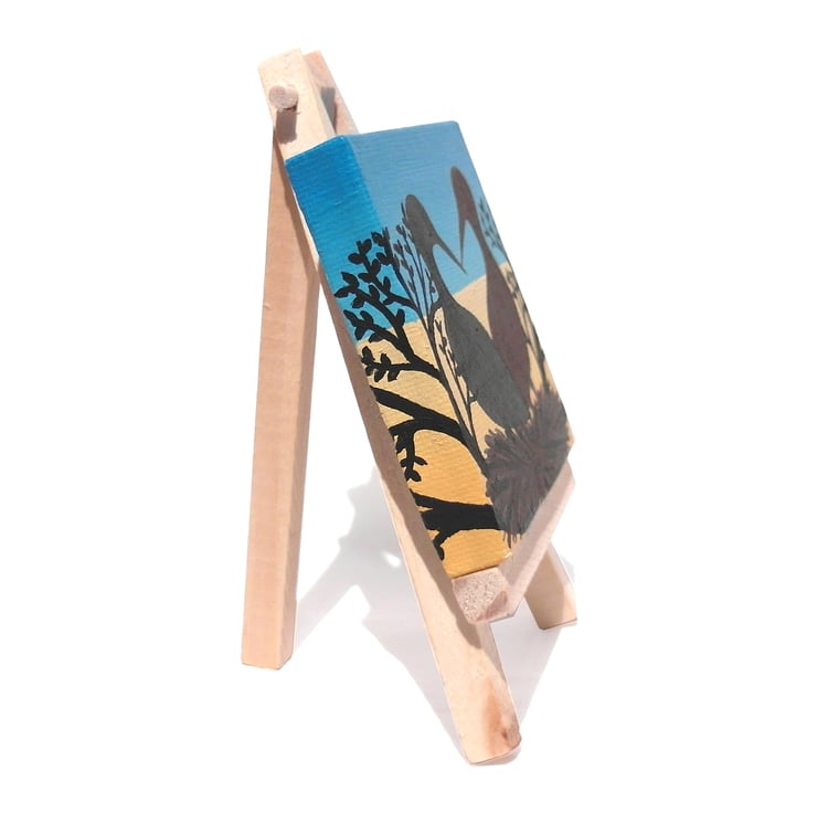 This original stork art is painted in acrylics on a 7.5cm (3") square canvas and is signed and dated on the back. Please note this is painted with acrylics that have a glossy finish, so any white marks on the photos are the light reflecting.