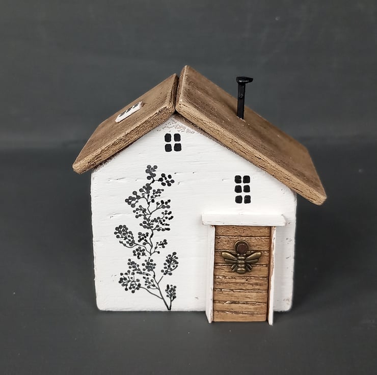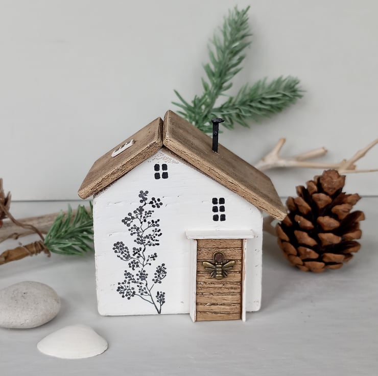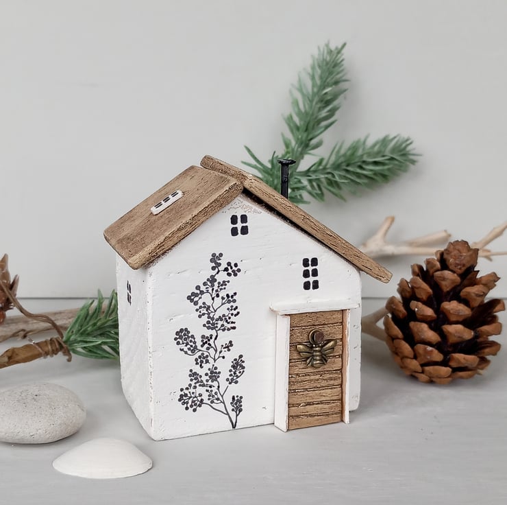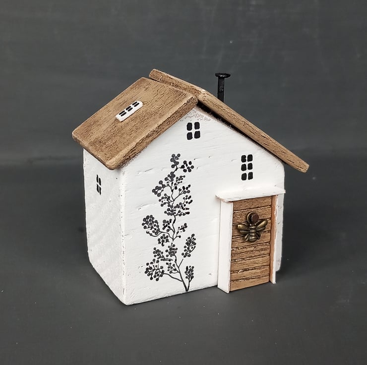 A white Driftwood Cottage, stamped with a wildflower and with a little Bee on the door.