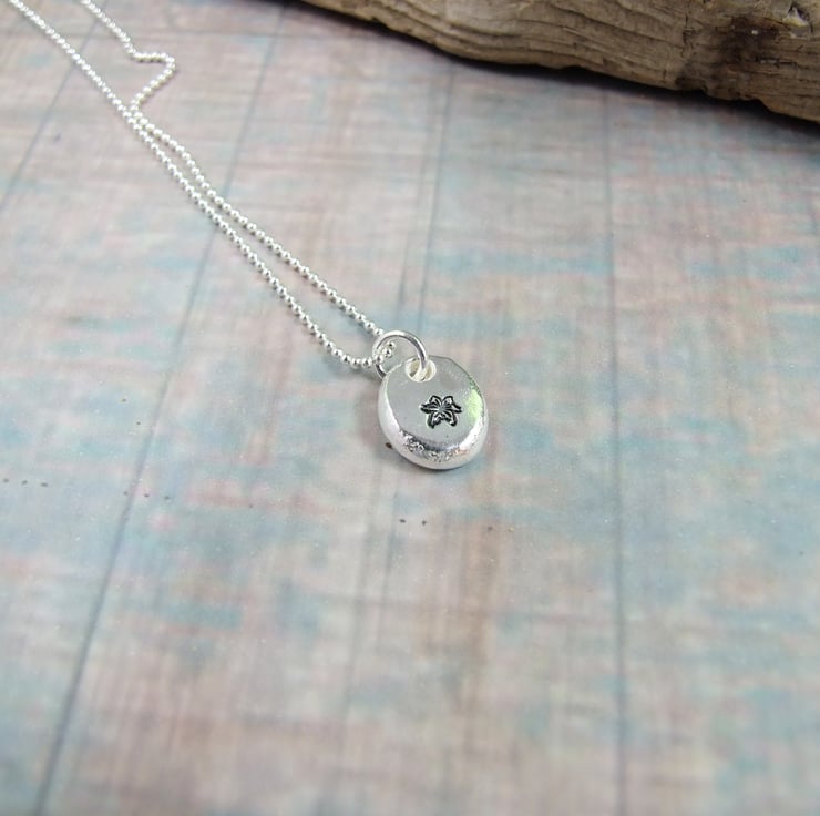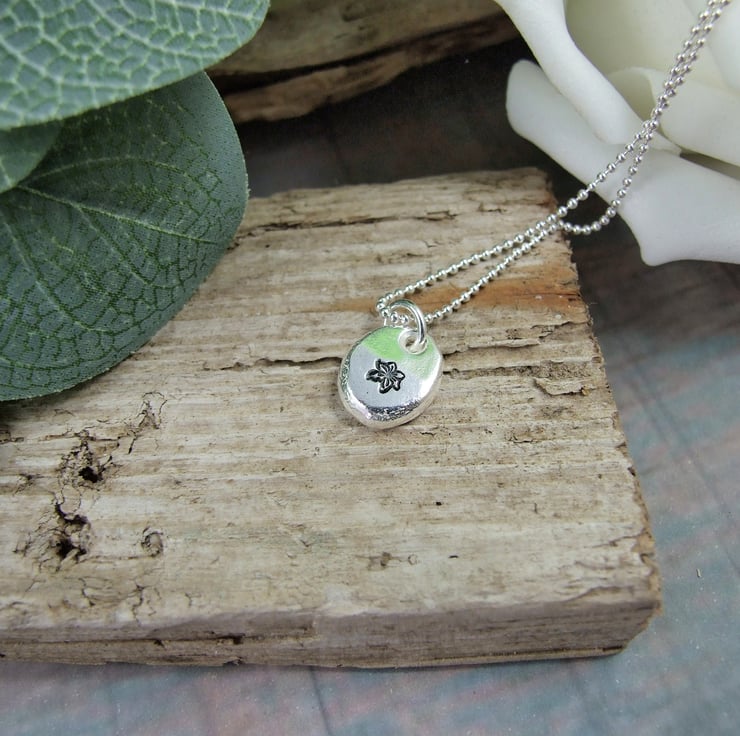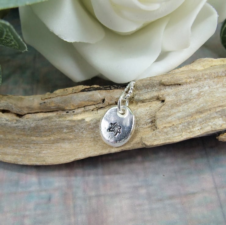I have created the silver nugget from recycled silver heated to melting point when it forms a natural pebble shape, then once cooled slightly flattened on the top and added the loop to hang. I then stamped on a little daffodil. Fitted to an 18 inch sterling silver chain.