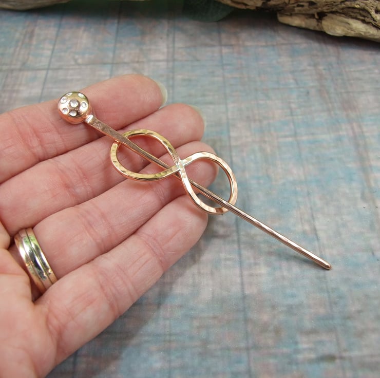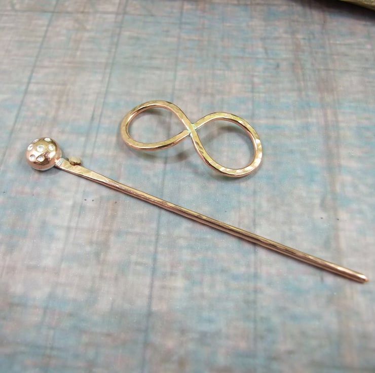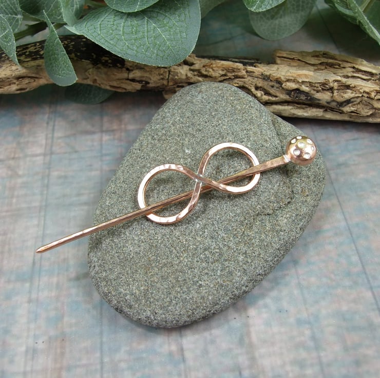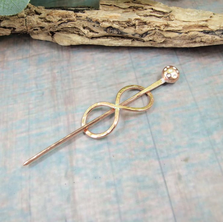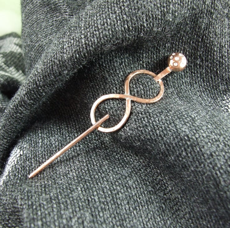 The infinity knot shape is hand forged from 2mm solid copper wire with hammered texture. The the pin is also made from 2mm wire, shaped with a rounded blunt point and a paddle shape at the other with decorated silver and copper button.