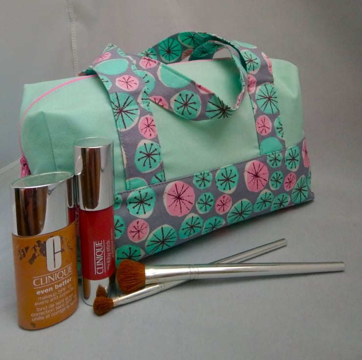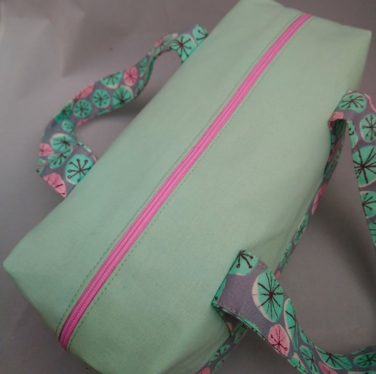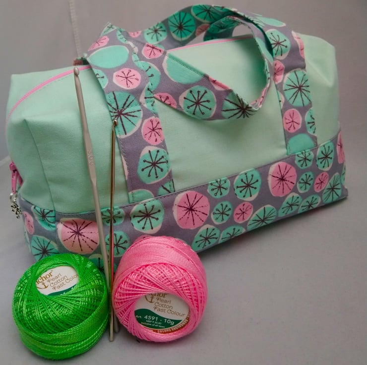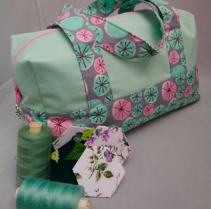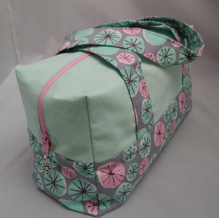 Craft Bag, Handled Box Shape Bag in a two different fabrics, lovely plain mint green contrasted with a patterned fabric with green and pink circles and a pink zip. Lovely combination.