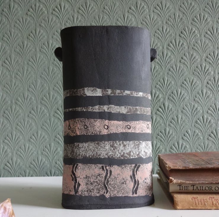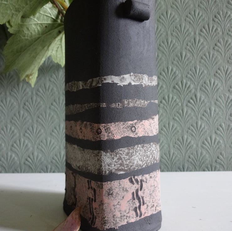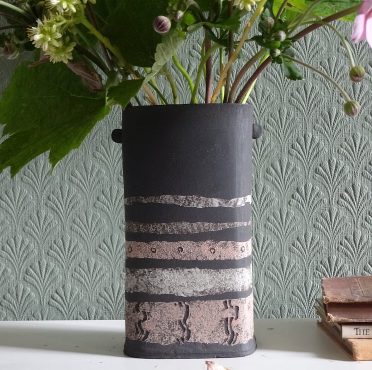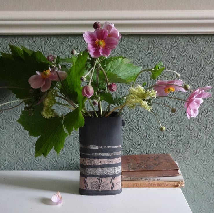 I handmade this ceramic vase in black stoneware, in a soft rectangular shape with pretty handle details. It's perfect to show off informal flower arrangements or just to sit by itself on a tabletop as a piece of art.The outside is the matt black of natural clay, with bands of soft pink and grey decoration fired into the surface. I glazed the inside with a toning iron lustre glaze to hold water.17.5cm x 5 x 9cm approx. On the base is my potter's mark of a swallow in flight impressed into the soft clay before firing.
