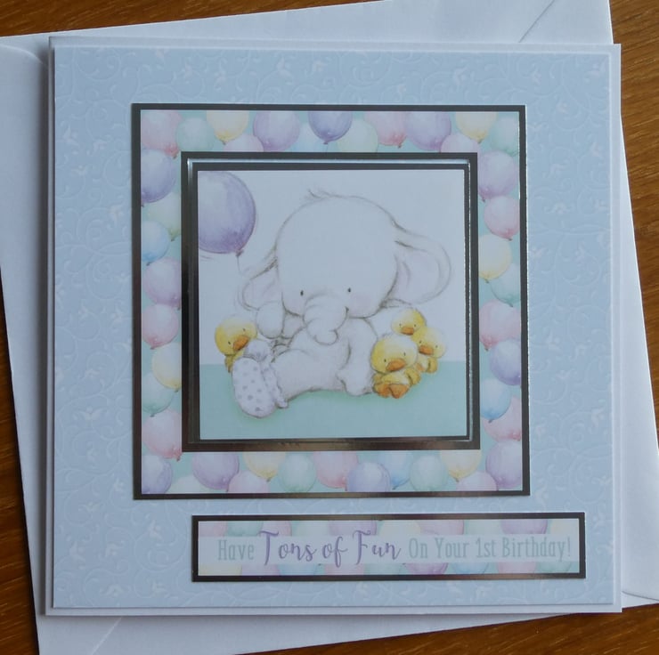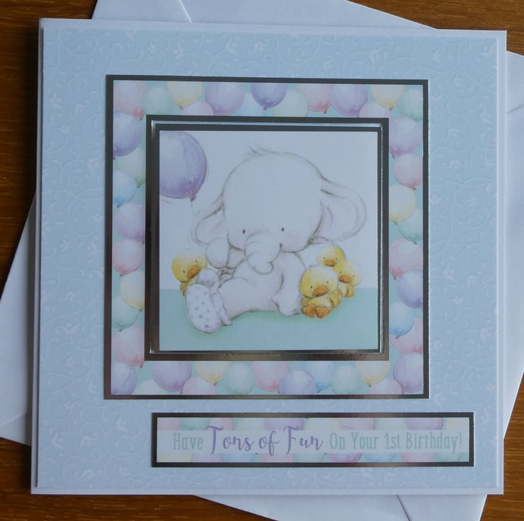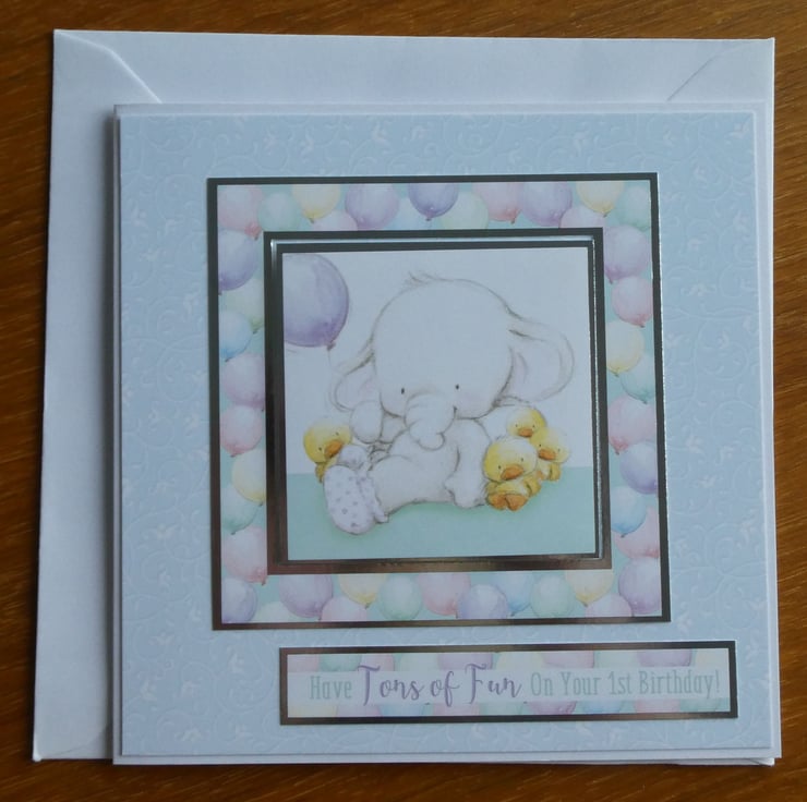 This one of a kind card First Birthday card has an image of an elephant and baby chicks.