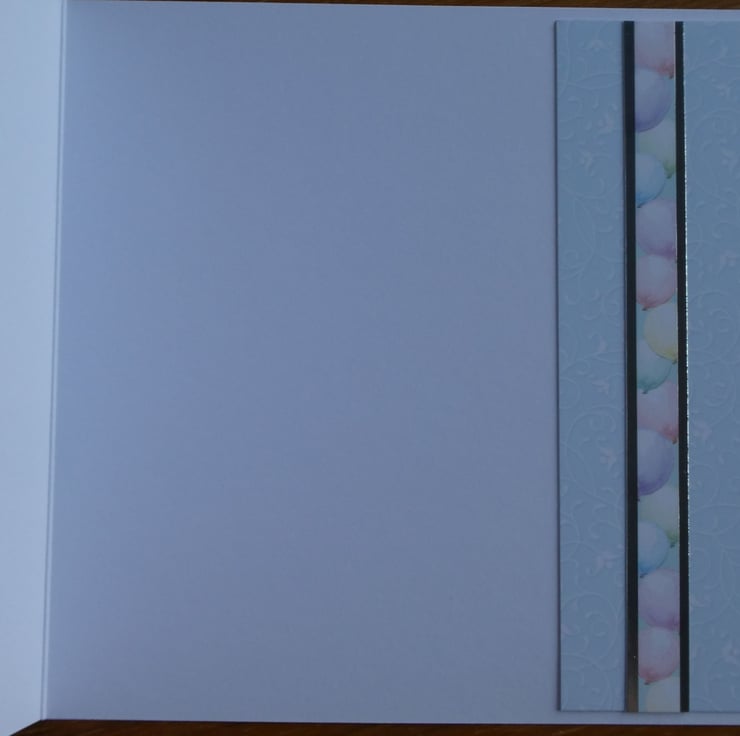 Down the right hand edge inside the card is a strip of matching pale blue and white swirls card with the same balloon border down the centre.