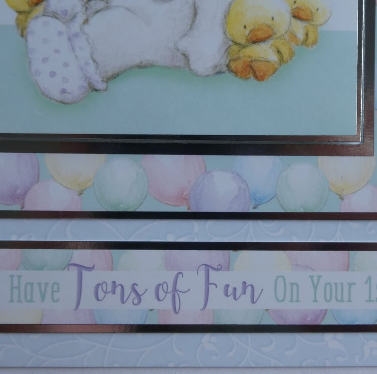 The image is surrounded with a frame printed with balloons in pastel shades and edged with silver foil.
