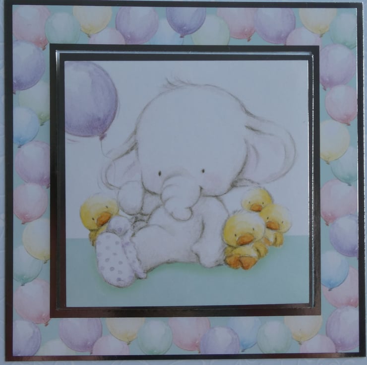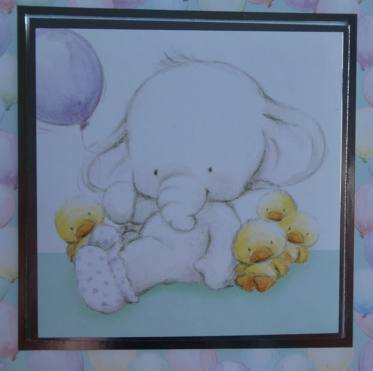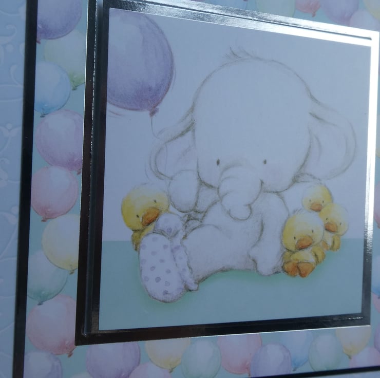 Printed on quality gloss card in shades of lilac, lemon, pastel blue and pink with silver foiled details the main image shows a sweet elephant holding a lilac balloon as it sits surrounded by little yellow chicks.