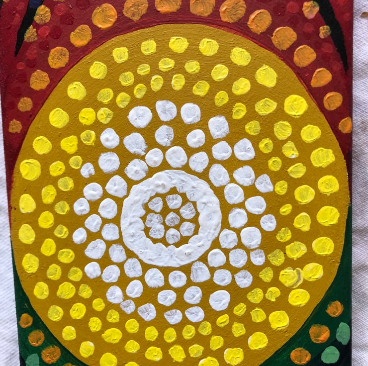 Inspired by aboriginal dot painting from Australia, I enjoyed painting this red, gold & green solar pattern.