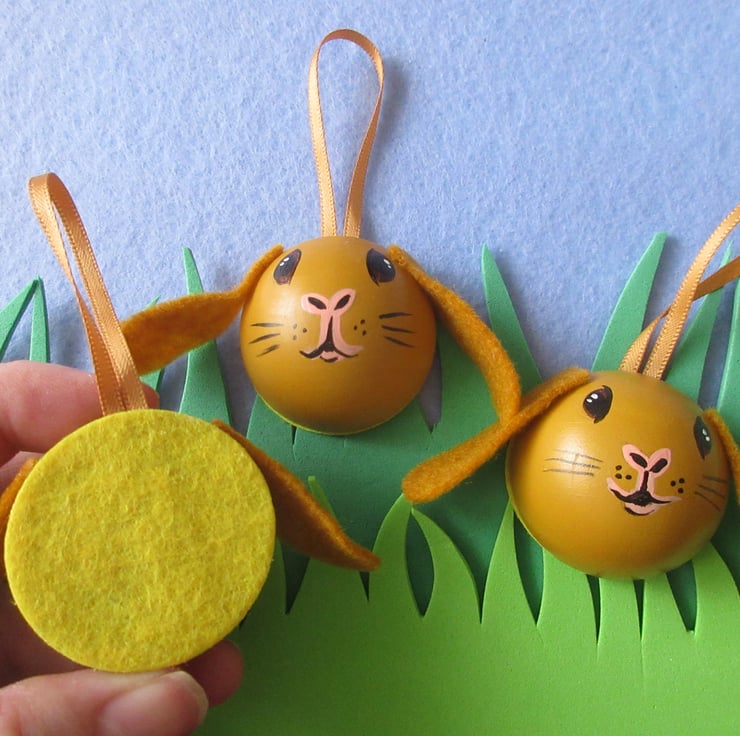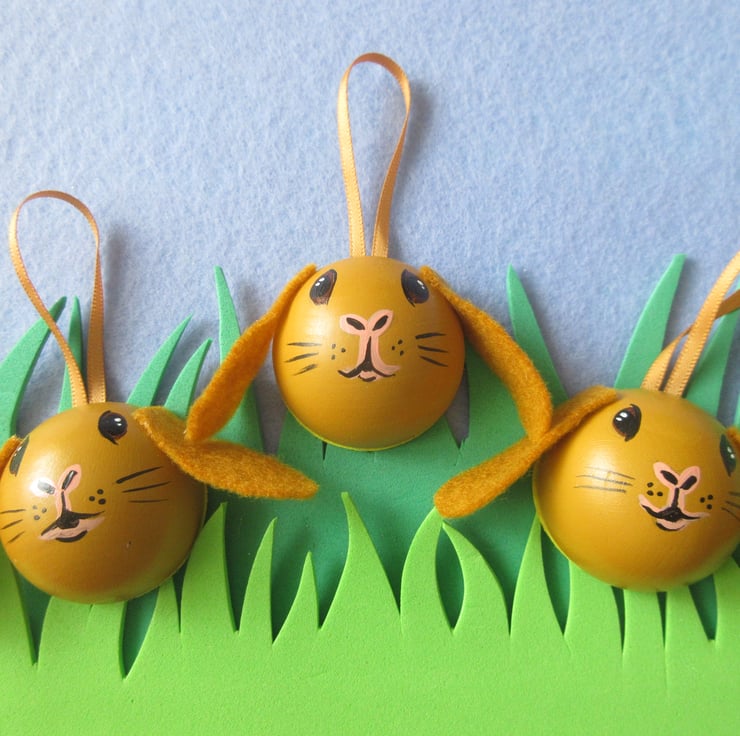 This is a set of three (3) hand painted yellow ochre coloured bunny hanging decorations (first image).
