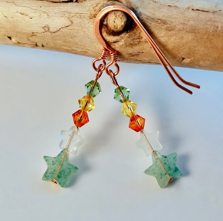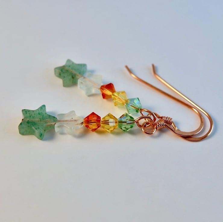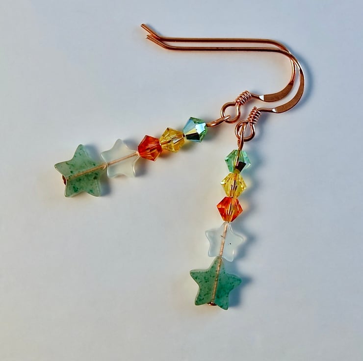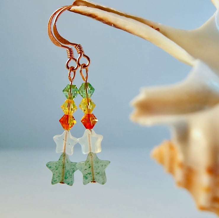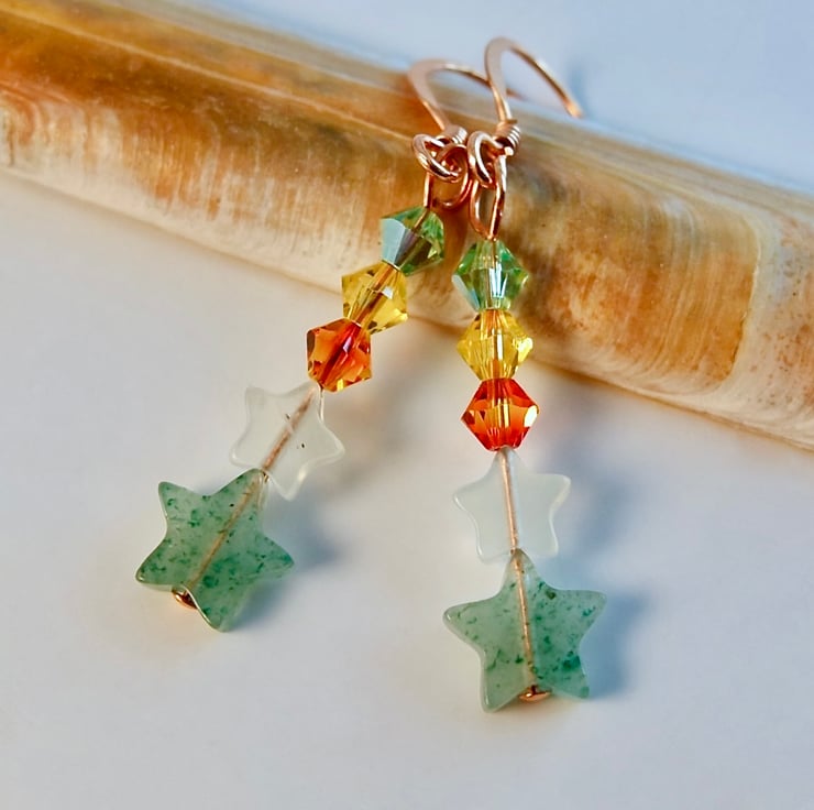 Bright, sparkly drop earrings featuring a 9mm Green Aventurine star, 6mm Jade star, and a trio of 4mm Swarovski crystal bicones in the colours 'fire opal', 'light topaz' and 'peridot'.