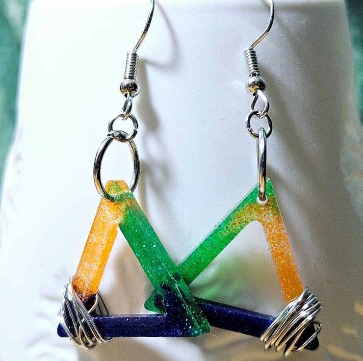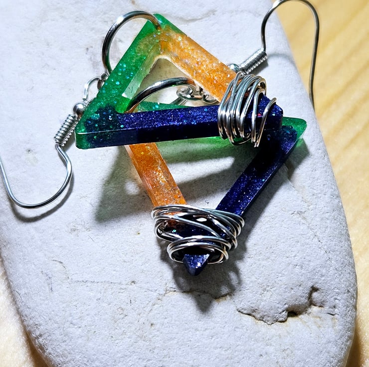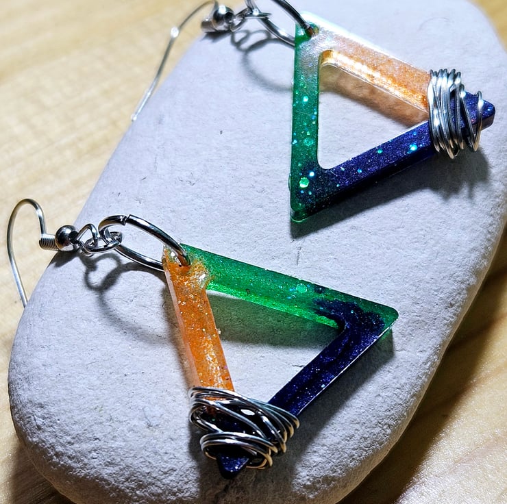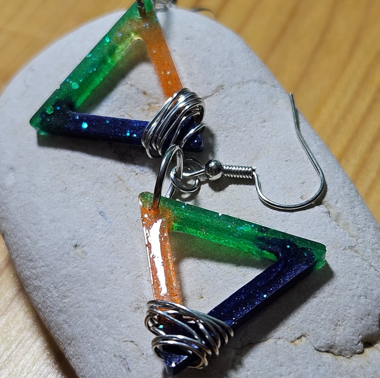 Handmade of resin, these triangular earrings are decorated with silver wire attached to stainless steel hooks.