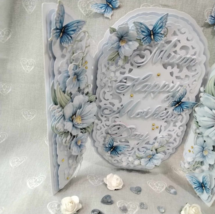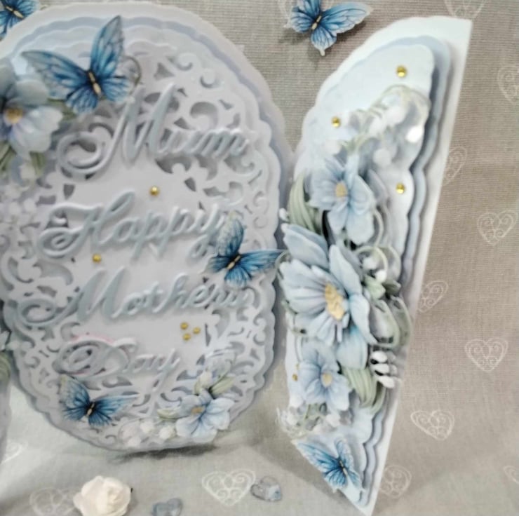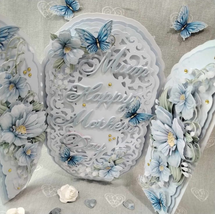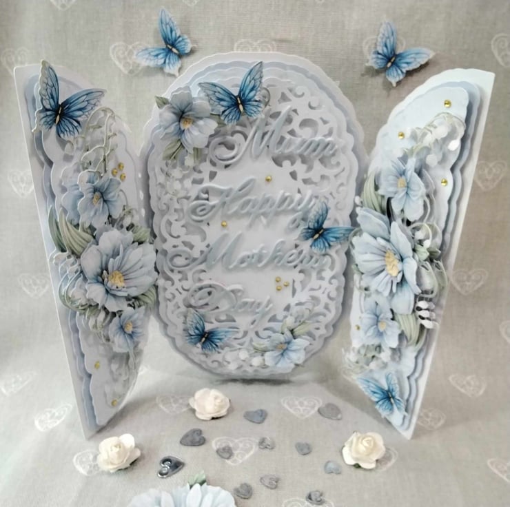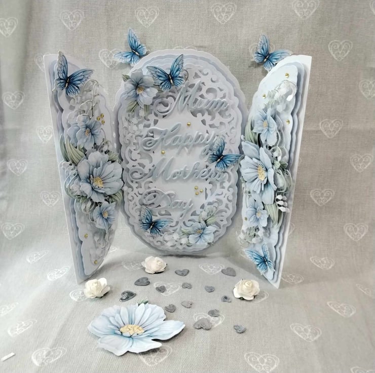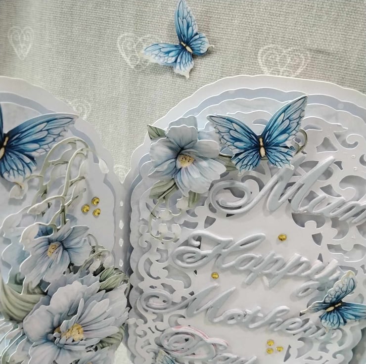 Center panel has a intricate, ornate, filigree topper panel, with the wording, Mum, Happy, Mother's Day, you can change this for something you wish to have on the card, this panel is embellished with decoupaged blue floral flourishes, 3d butterflies and faux gems. Each side panel has it's own decoupaged, blue floral flourish, again decoupaged for depth and dimension, then Embellished with 3d butterflies and faux gems, this card comes with a presentation box, lined with tissue paper. if you wish to personalize your card, please contact me, to discuss this, also, please check spelling and punctuation, as this will be how it appears on your card, many thanks Karen