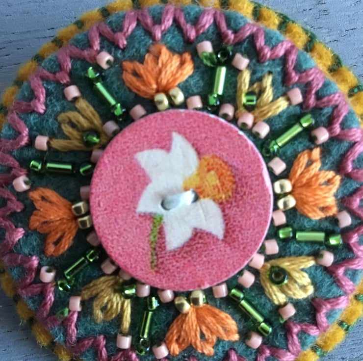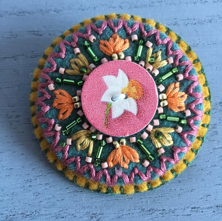 This Hand Embroidered Daffodil Brooch has a wooden button with a picture of a Daffodil Flower stitched onto circles of green and golden yellow felt. Hand embroidered Lazy Daisy and Fly Stitches radiate from this button, decorated with peach and green bugle and seed beads. The brooch is edged with Blanket Stitches in green embroidery thread.