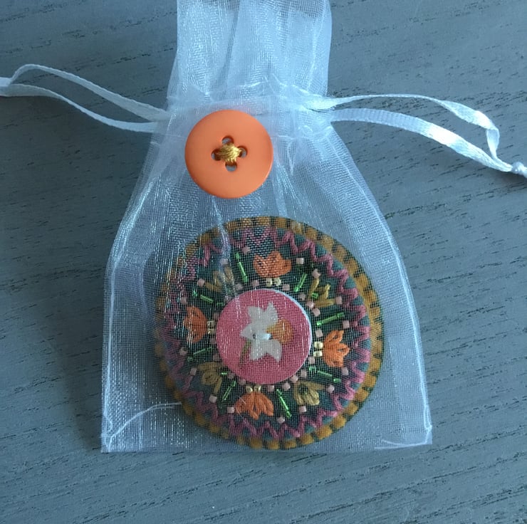This brooch is gift wrapped in an organza bag, decorated with an orange button. A protective bag to keep the brooch in when not worn.