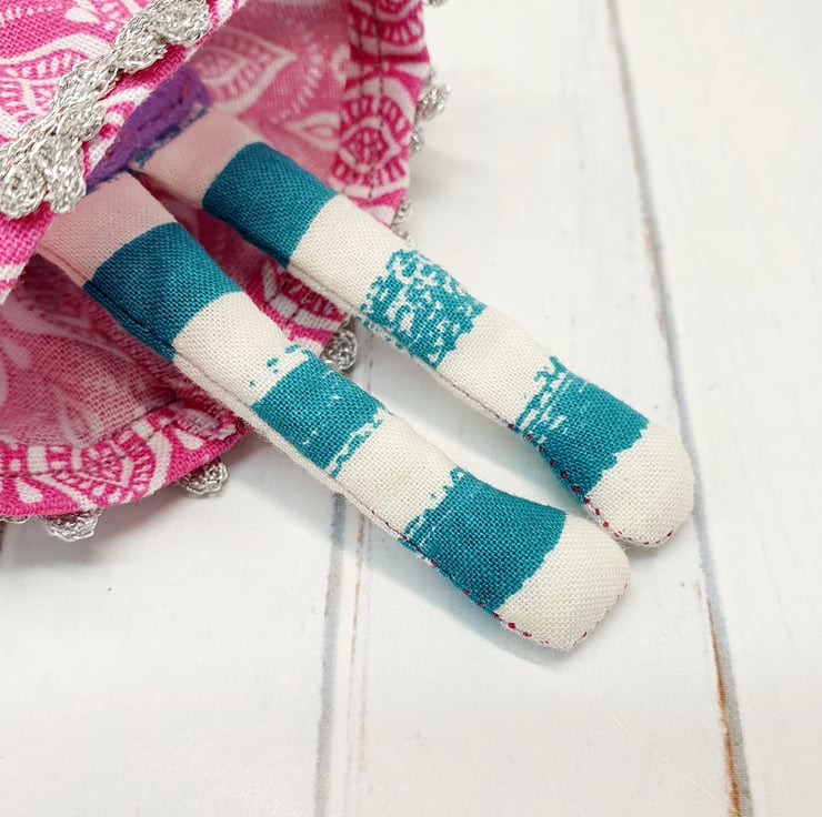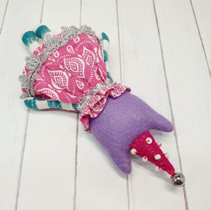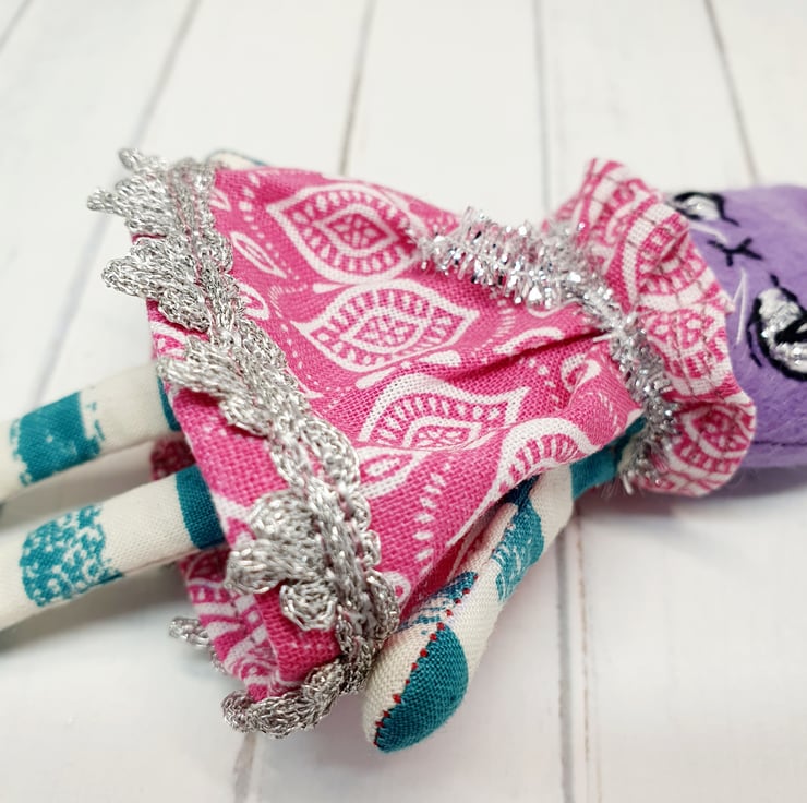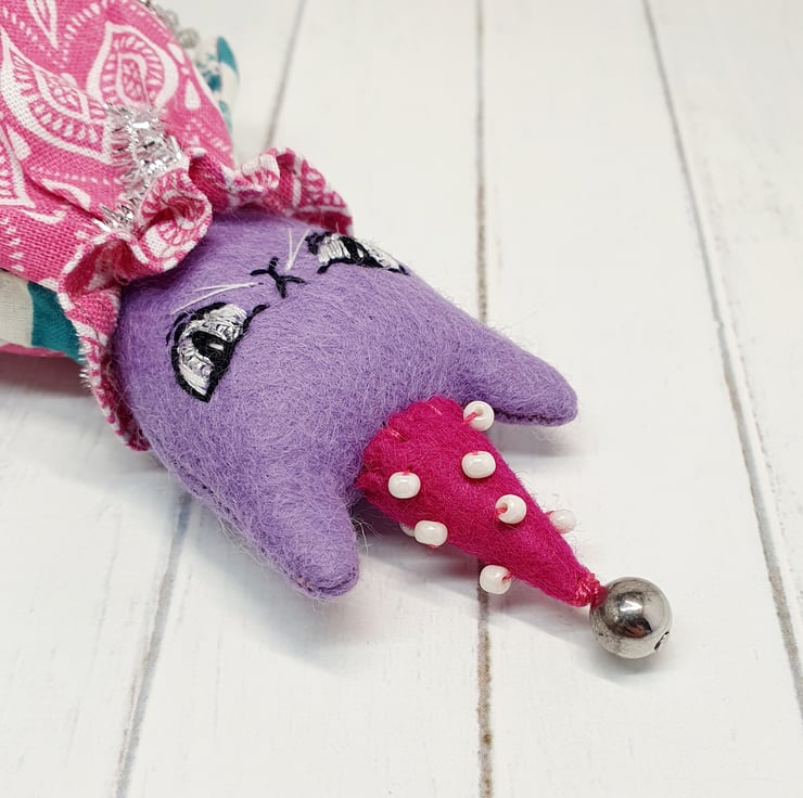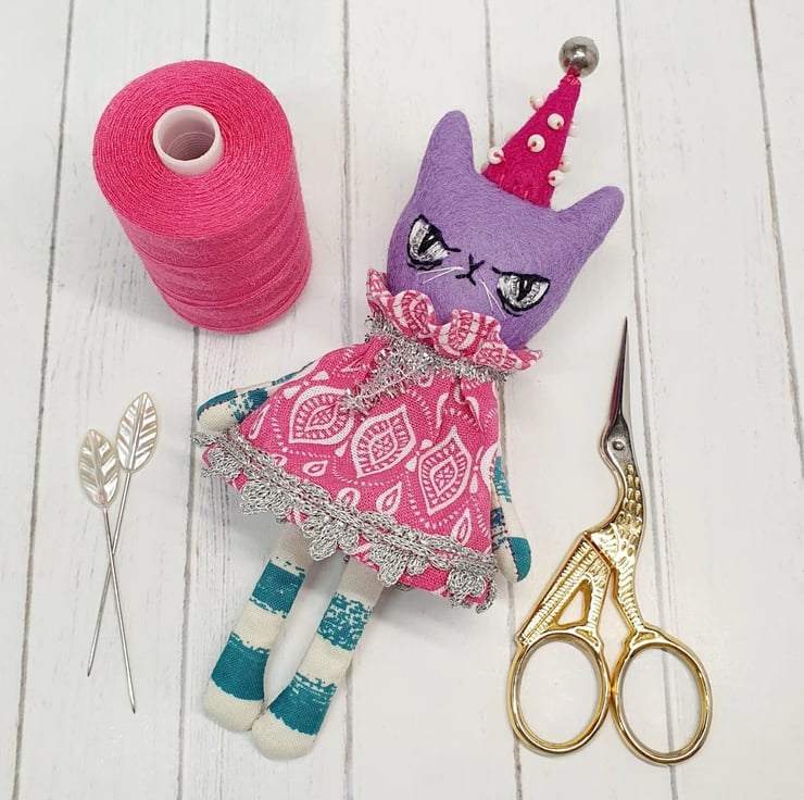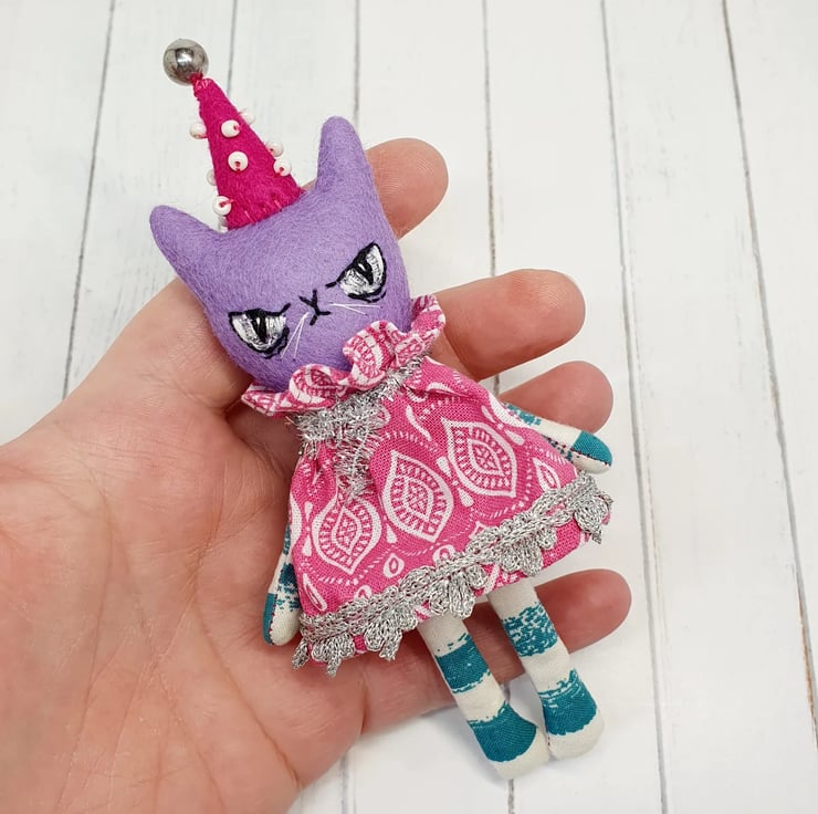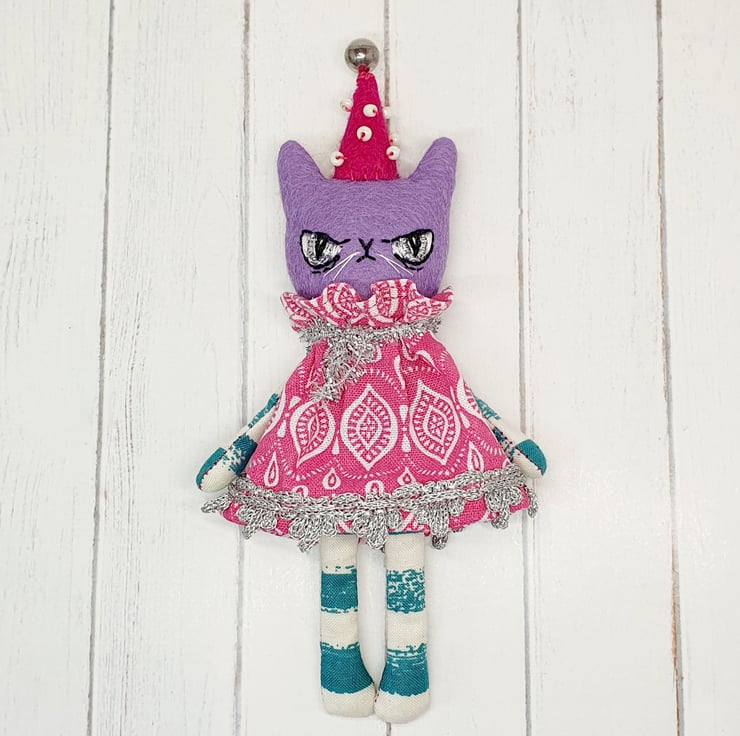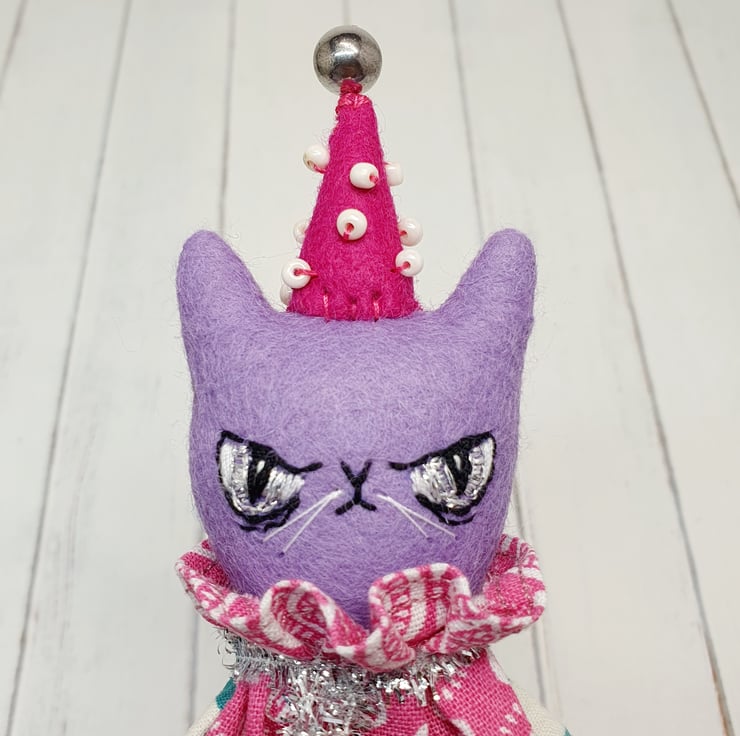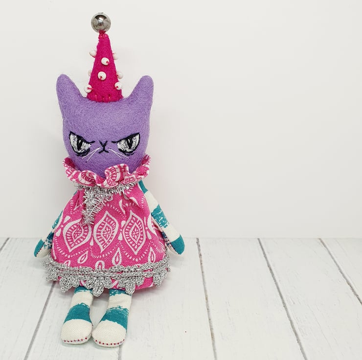 Felt art doll with hand embroidered grumpy face. Doll wears dress with trim. Dress is sewn into place. Kitty wears a felt party hat with beads and silver coloured bead on top, hat is sewn into place. Doll has stripey arms and legs and measures roughly 15cm tall. This is for decorative purposes only and not a toy.