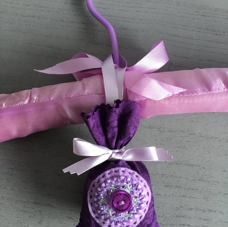 A purple cotton fabric makes the lavender bag, with a lilac ribbon, tied in a bow for hanging loop…..to hang over a coat hanger, over a drawer or cupboard handle.