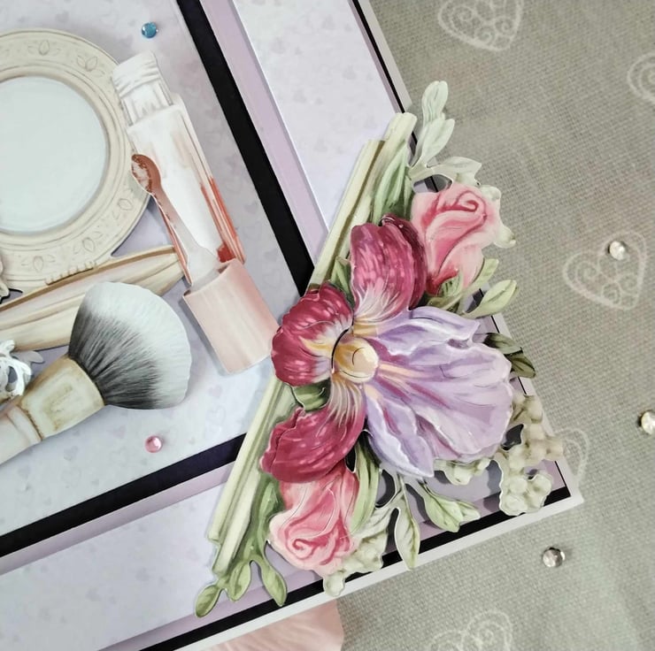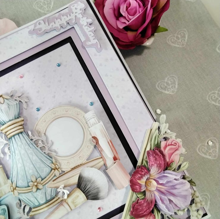 Hand-made, personalized, luxury Mother's Day card. A fabulous card, with depth and dimension, and a touch of sparkle for a fabulous, Fashionista Mum, an array of beautiful make-up products, perfume, lippy. nail vanish, lip gloss, compact, brushes, all perfect pressies for Mum on Mother's Day, with flowers too! Personalize with a sentiment or verse of choosing, otherwise it will come with Happy Mother's Day, To My Wonderful Mum (recipient of choice). this card comes with a presentation box, please contact me to discuss your personalization, check spelling/punctuation, as this will be how it appears on your card, many thanks Karen