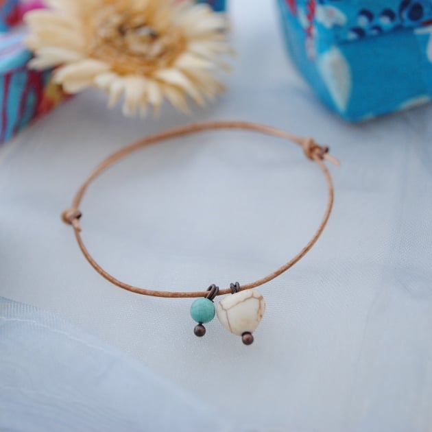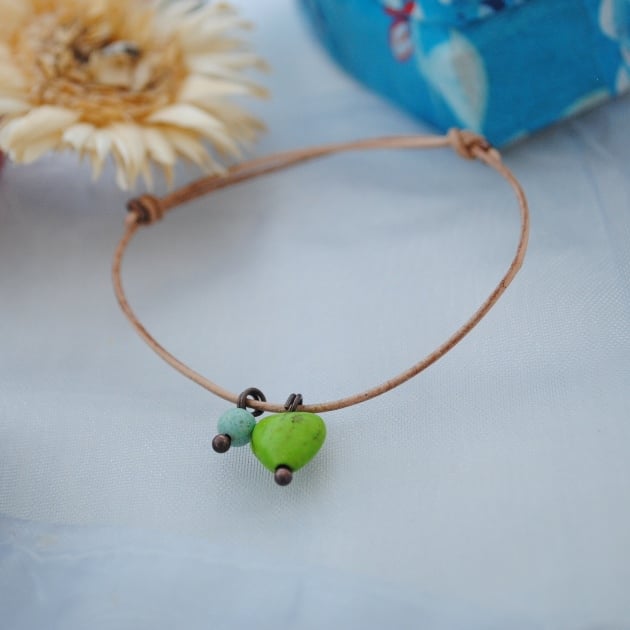 Natural leather friendship bracelet with a howlite heart charm in green or white with a turquoise bead.