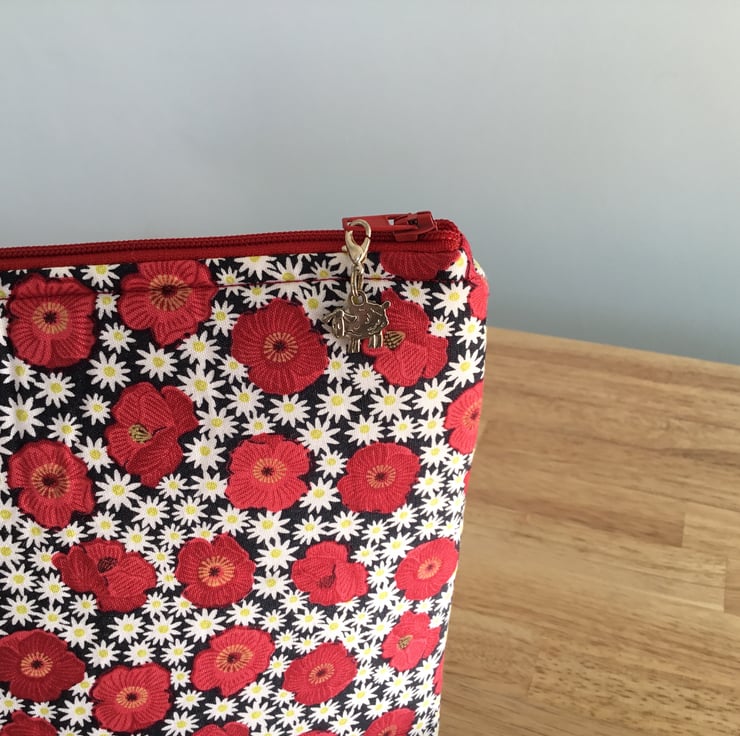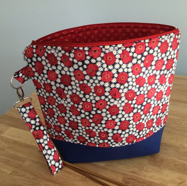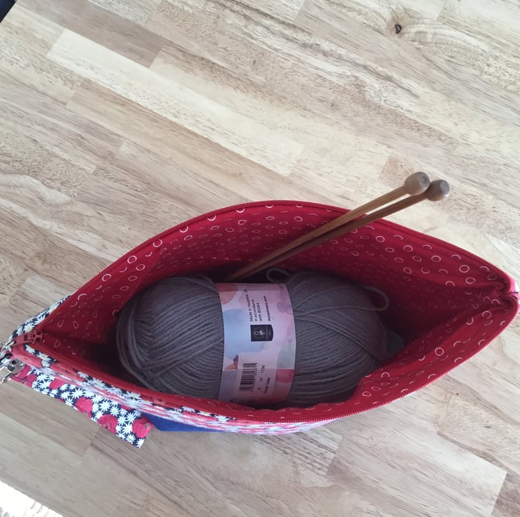 A large zipped knitting, project bag. Made with 100% cotton fabric with a fusible wadding which is soft but also gives it some stability. The bag features a handy clip which can be used as a stitch marker, it has a handy detachable strap in matching fabric.